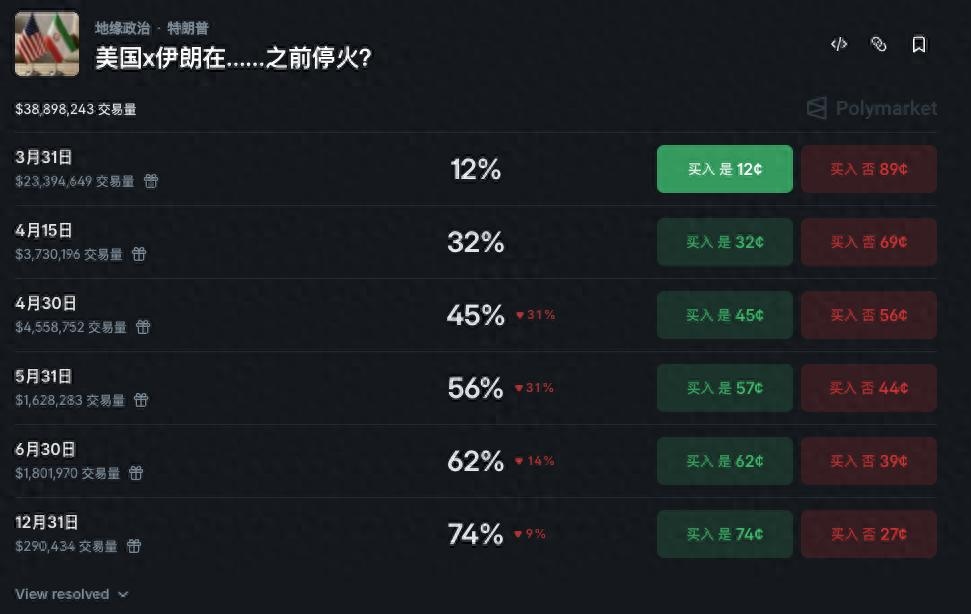 pollymarket的概率显示3月底停战的概率只有12%,但拖两个月,中国的石油储备也会开始消耗。
