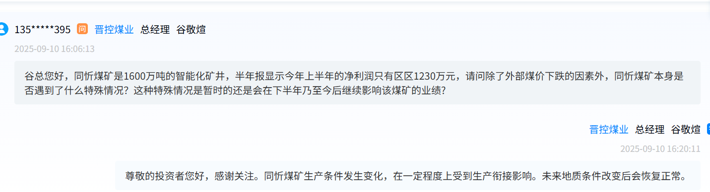 业绩说明会解释说是地质条件发生变化影响生产,说明后期同忻的业绩会逐步改善,增加晋控的投资收益。