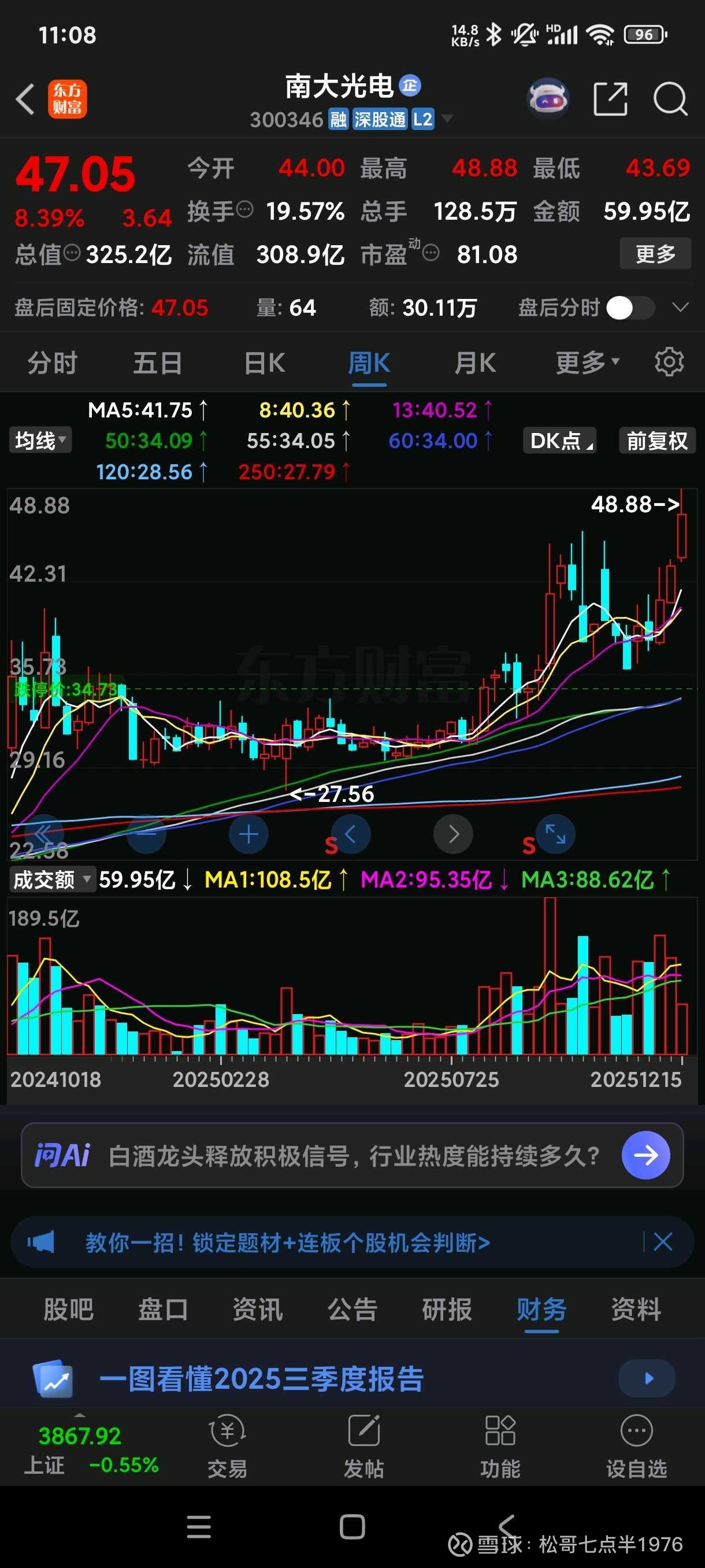 2025 年三季报的南大光电,就像一位“戴着护目镜、左手拿试管、右手拿计算器的理工学霸”——营收 18.84 亿元,净利 3.01 亿元,扣非净利同比 +18%,毛利率 41% 环比抬升,账上躺着 6.26 亿元经营现金流,怎么看都是“别人家的孩子”。可学霸也有自己的烦恼:ArF 光刻胶才刚破壁,日本“三座大山”仍高高在上;乌兰察布 NF3 新厂刚点火,价格战阴云就飘过来;应收账款占利润 225%,客户一拖延,报表立刻“脸着地”。下面咱们把亮点、催化剂、黑科技、朋友圈、家底股权、风险,一口气聊个透,保证有料又有梗。