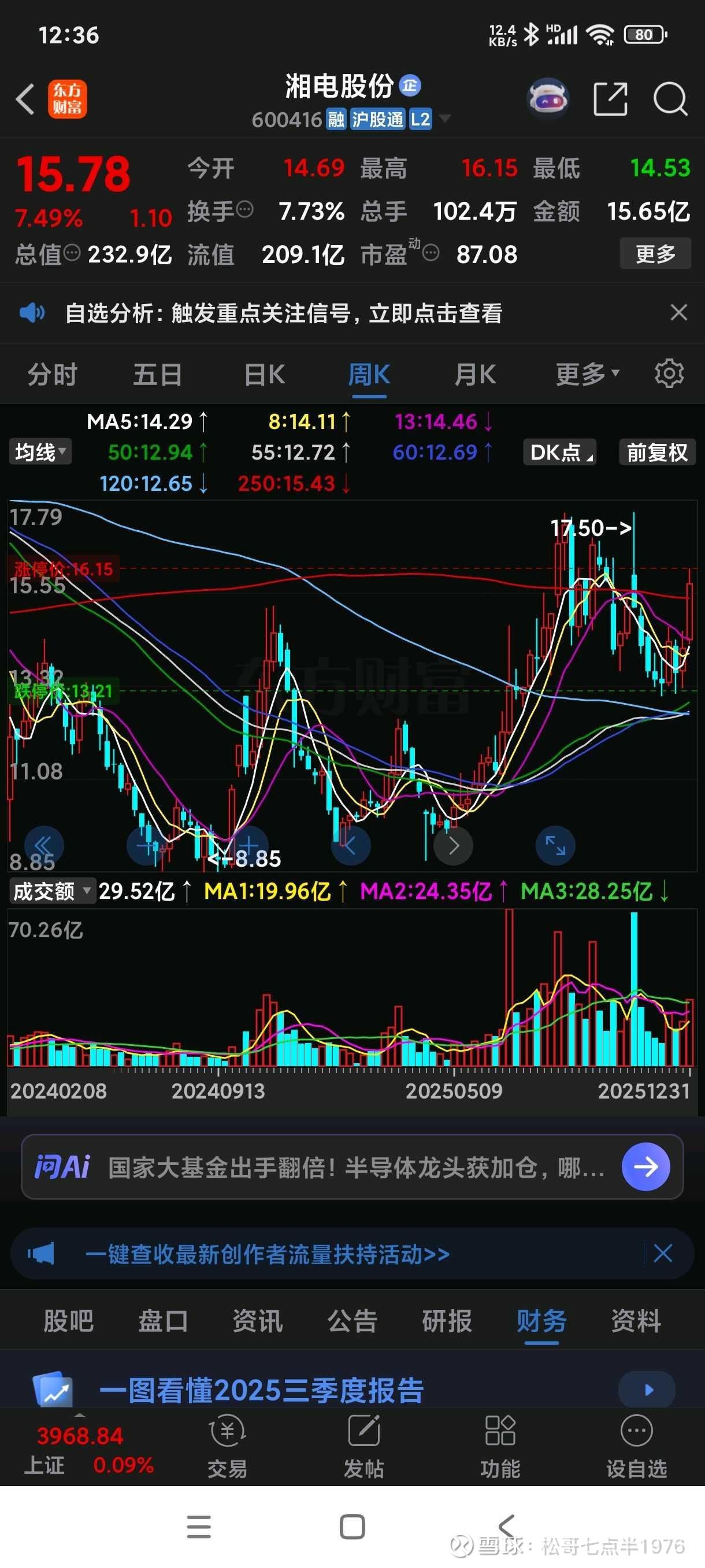 军工重大合同一般“突袭”披露,金额 5 亿元起步,涨停只需一纸公告。把湘电设成“雪球”预警关键词,比盯 K 线有效。