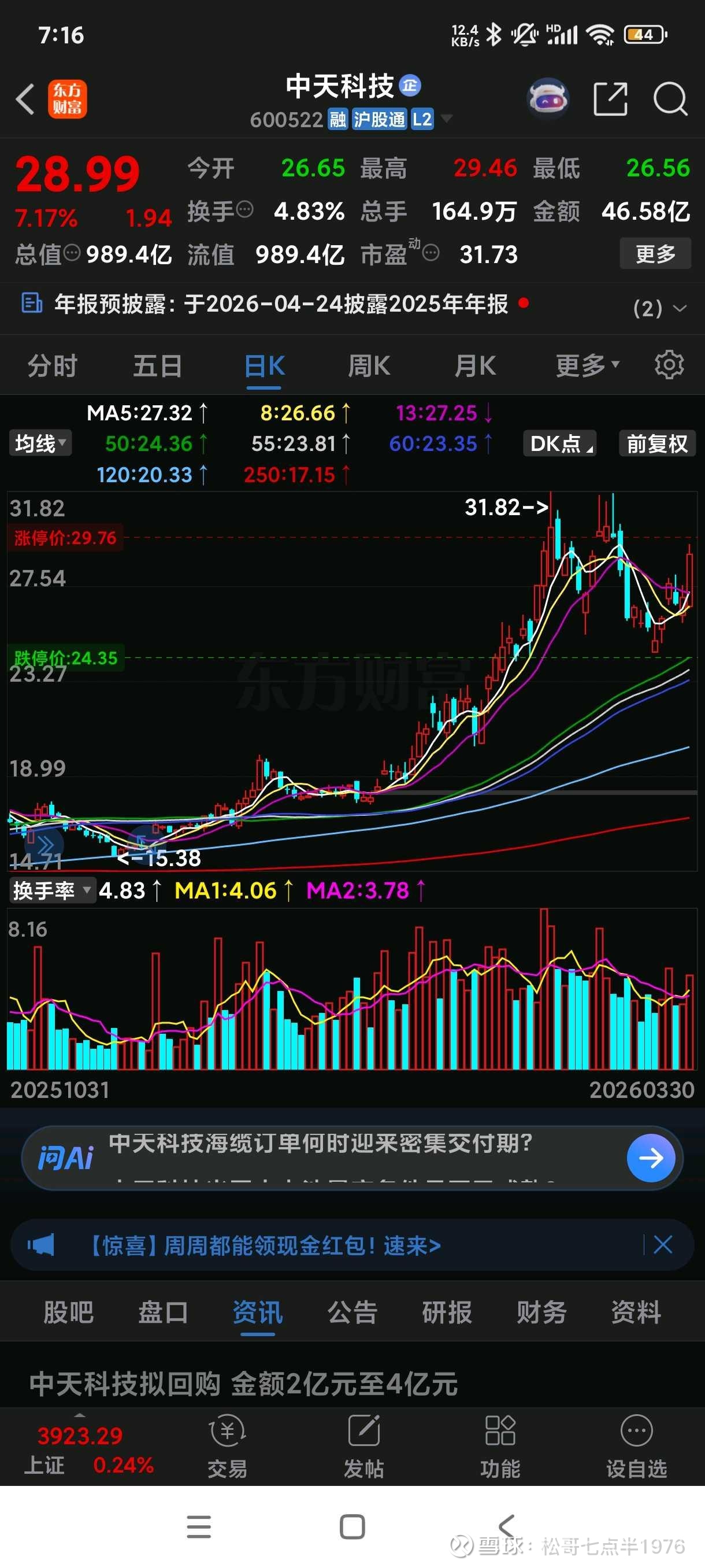各位投资圈的老铁们,今天咱们来聊聊一家堪称"海底电缆界茅台+算力基建隐形冠军"的神奇公司——中天科技。这家公司就像是那个在班里默默无闻但门门功课都拿A的学霸,平时不显山不露水,但仔细一看成绩单,嚯!简直是海洋经济+特高压电网+AI算力+新能源储能的四栖作战全能王!更妙的是,就在今天(2026年3月30日),公司刚刚扔出了一个重磅炸弹——新一轮2-4亿元股份回购计划!这就好比学霸不仅成绩好,还主动给全班同学发福利,这种公司上哪儿找去?