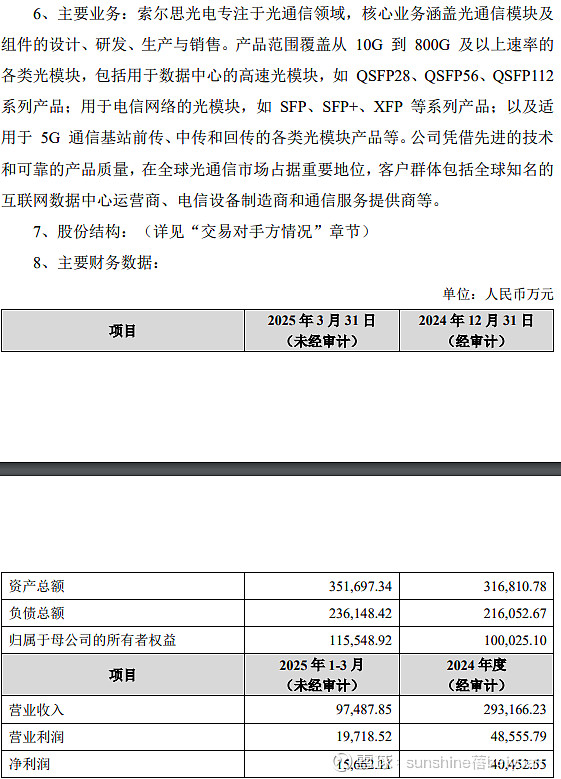 $东山精密(SZ002384)$1、根据1月27日投资者互动和2025年11月17日的公告,公司收购索尔思100%股权,已完成并表工作,2025年10月即纳入并表,股权交割手续正在办理;2、并购标的索尔思的业务和业绩(2025年1季度1.5亿,预估全年?亿);(未完待续)