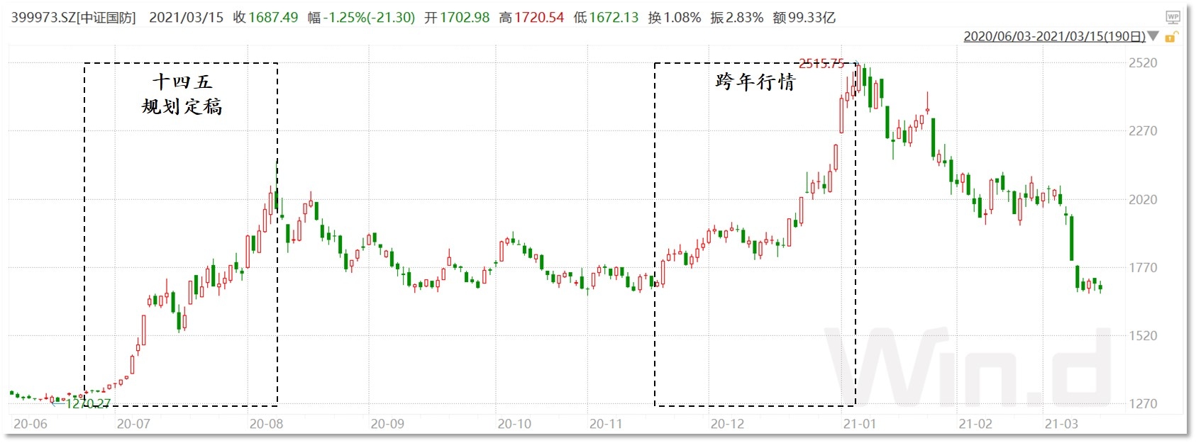 2)11月中旬至次年1月初,其背景在于十四五规划定稿之后,市场提前开始交易订单落地以及由此带来业绩高增预期,即典型的“跨年行情”。