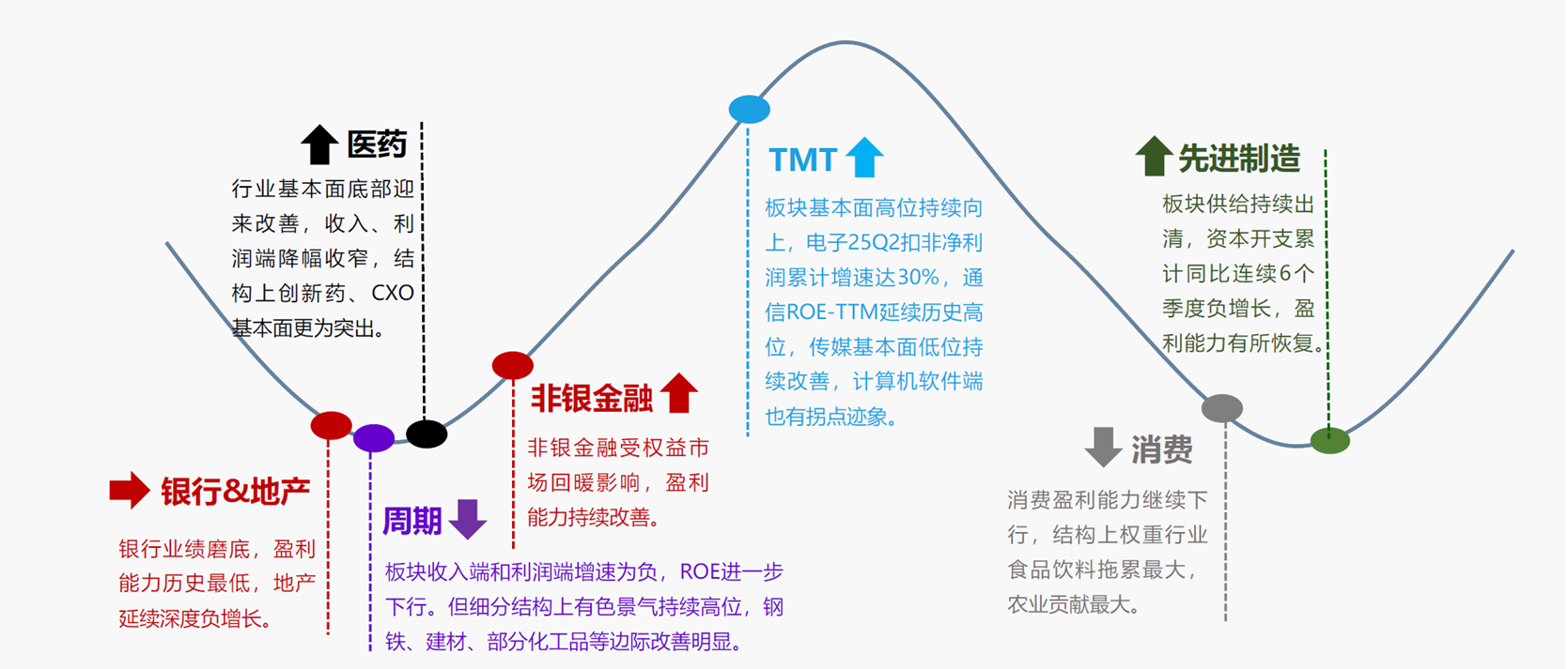 我们则倾向于认为9月上旬的调整仅仅表明第一阶段由主题和事件驱动的行情结束了,短线和博弈的资金相应离场,之后才会迎来真正的由订单和景气驱动的基本面行情。而从行业景气周期的位置上看,当下才刚刚处于景气从底部向上的拐头的阶段(参考下图先进制造板块的位置)。