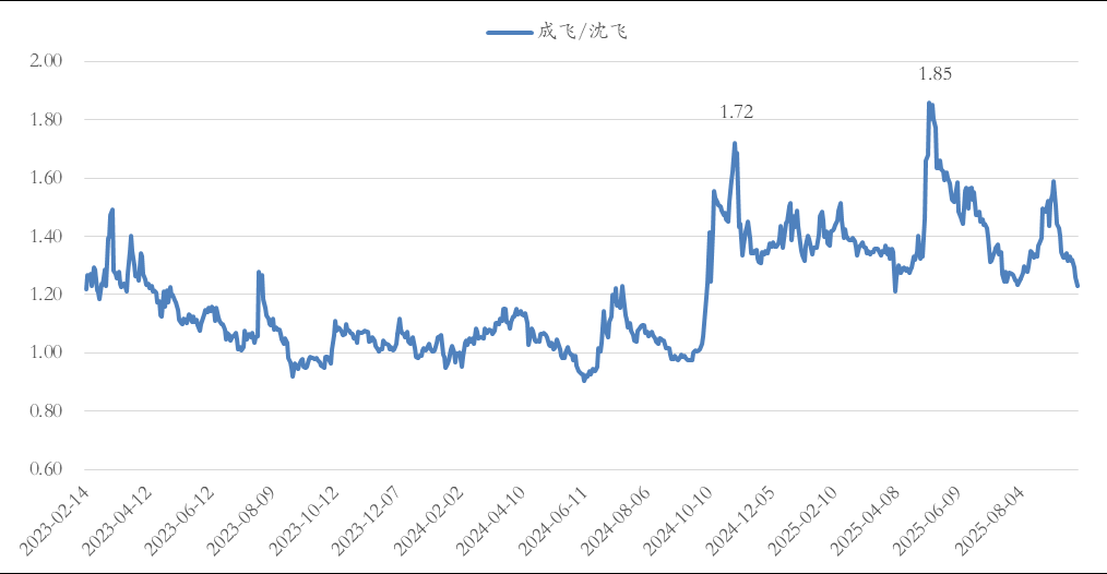 而从结构上看,站在中东国家的视角,更为高端、更为先进的歼-35显然会成为首选。所以,我们也能看到近期中航沈飞的股价走势确实显著强于中航成飞(下图为成飞/沈飞市值比)。