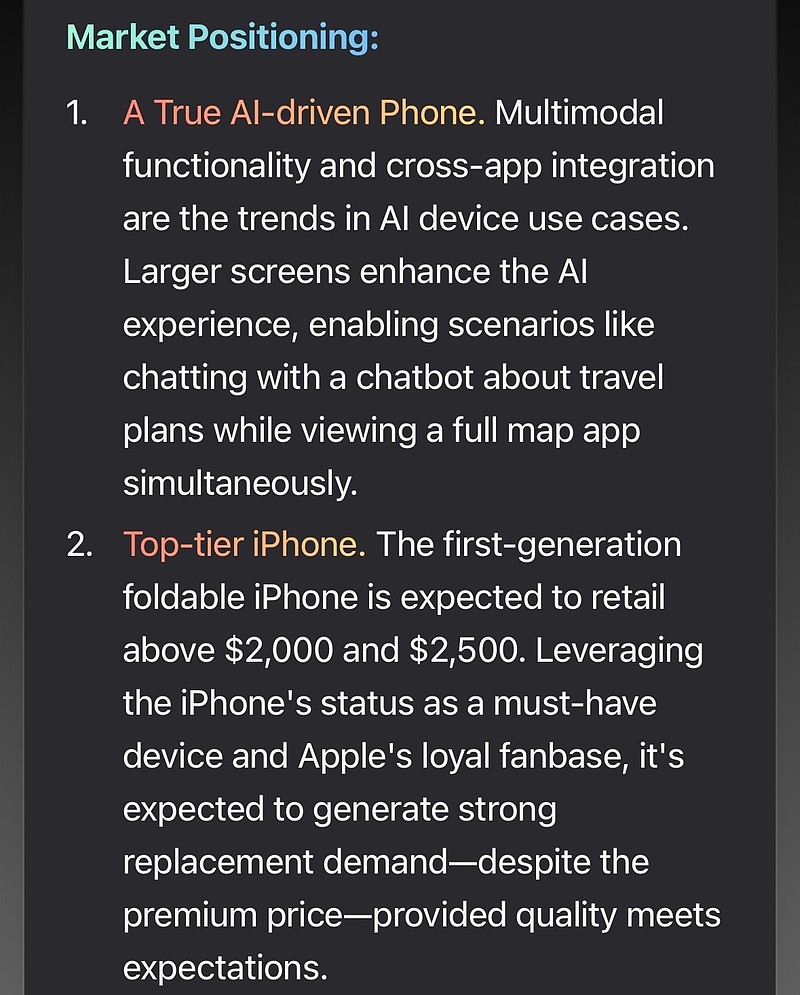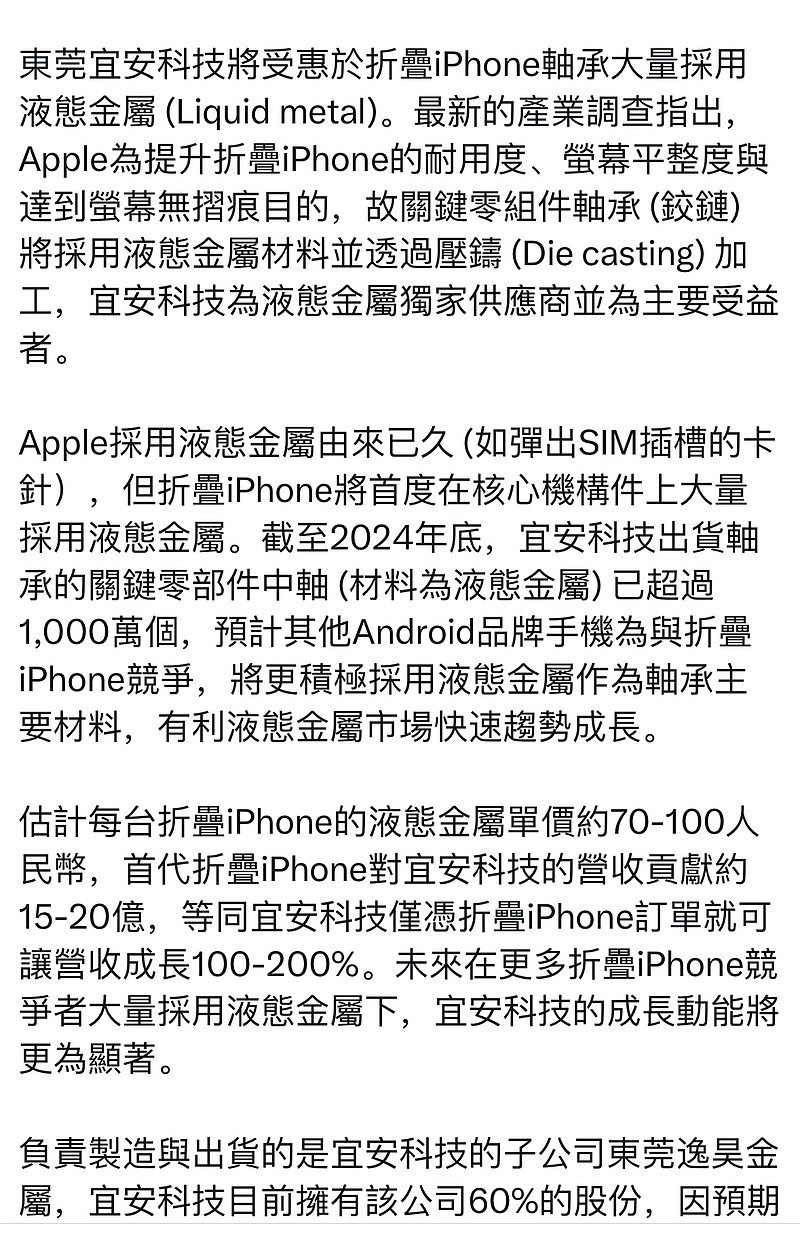 说明年是苹果的大年,我主要看两点,第一点是第一次发布折叠屏,最近又在上调出货量,第二点到时候Siri的AI搜索打磨的差不多了,看好苹果能出爆款的AI 智能终端,就是折叠屏手机。