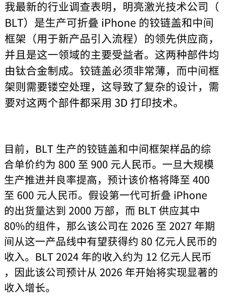 现在谁也不知道苹果的折叠屏铰链细节长什么样,苹果的保密做的太好的。目前,国内几家手机厂商,Oppo.Vivo.荣耀.小米,折叠屏用3D打印方案比较早,主要是后盖的钛合金和一些其他的零件,其实看照片还属于比较简单的产品,单机价值量不会特别大。但是,他们跟苹果的3D打印完全不一样,苹果的方案是行业颠覆。