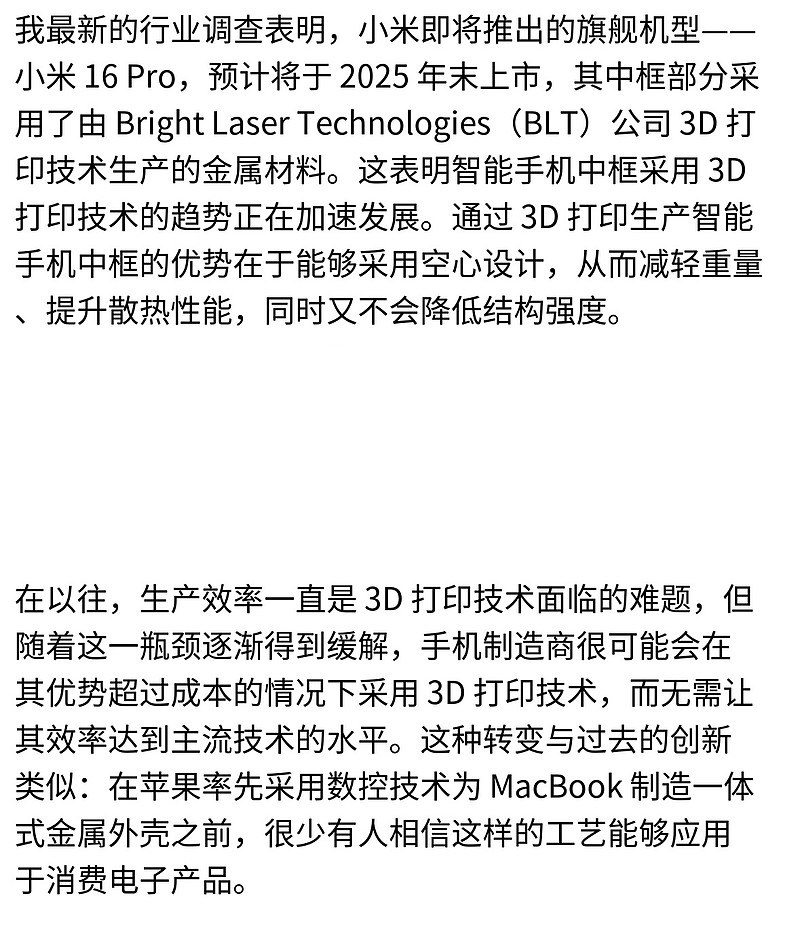 配合和服务能力,据说苹果这个铰链,配合打样,BLT废品已经有一小车,所以可见很难。当然除了本来做3D打印的公司,行业外的传统果链也在追赶,比如歌尔.宜安等在买设备,长盈打算自己造设备这样。