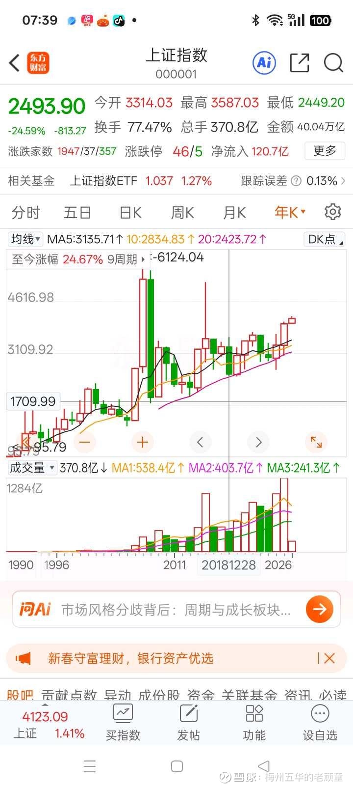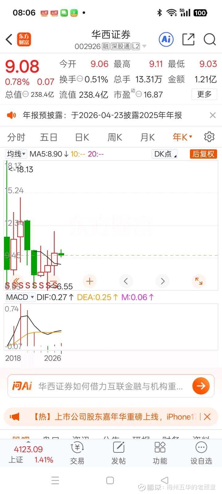 老顽童从不玩稀的。我买股票首先是考虑本金安全,在业绩即将创出历史新高之际。股从2018年上市的历史高位18.13元(当时上证指数年线最高是3567,收盘是2493点),到现在指数为4120之上,业绩也己接近历史新高之际,股票在未经扩股之下,只有当年高位时的一半。再怎么看也是极其不合理的。价值投资在证券市场是唯一能保持长久活下去的原因之一,而华西证券的价值回归之日,只会迟到,不可能不到的。