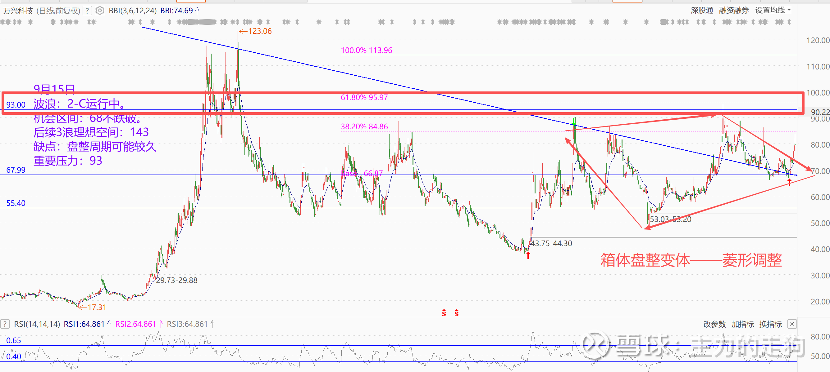 最后,一旦万兴突破93-96这个区间(必须有大中阳),那么,它的空间就彻底打开了。我计算的空间点位是在143元附近。