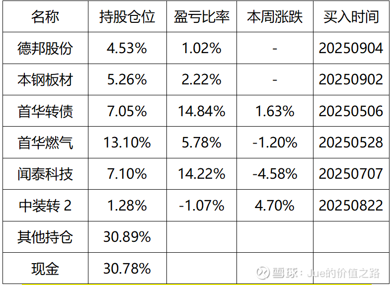 本周我的组合回调幅度和上证指数差不多,主要是前三天的回撤非常明显,我在周四也写了一篇关于本次回调的反思,由于上周对组合进行了减仓,空出了4成的仓位,本周新建仓了两个标的,一是本钢板材,周二的文章已经详细陈述买入的理由,感兴趣的朋友可以去看看;二是在周四建仓了德邦股份,主要逻辑考虑物流快递反内卷,业绩可能反转,其他快递公司已经涨了不少,德邦没怎么动;还有就是京东借壳,京东作为大股东一直在增持,而且上市公司自己也要回购,股价算是也有一定托底。目前我的仓位大概70%,具体持仓情况如下: