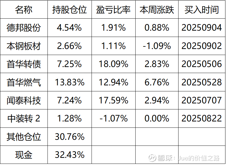 本周我的组合小幅回升,主要得益于首华燃气和转债的上涨,现在的情况由于首华的仓位比较重,所以首华表现好基本上整个组合就不会太差。其实可以看到,市场现在明显是结构化的上涨,也就是部分标的上涨带动指数整体上涨,从这次市场的整体表现看,未来也很可能会维持这样的状态。我个人目前对于指数还是相对乐观的,尤其周五上证突破了3888.6点的前高,预计国庆节前很可能会向4000点发起冲击。目前我的仓位不到70%,这个月的目标就是能够守住现有的收益。具体持仓情况如下:
