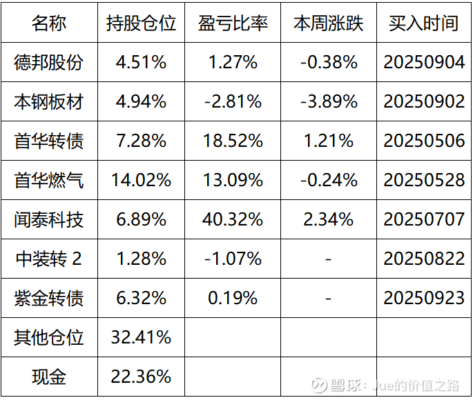 对于首华燃气和首华转债,本周开始在尝试高抛低吸,尤其对于转债来说,如果一旦卖飞可能就不会再买回来了,所以在四季度如果某次总结时不再持有首华转债大家也不用太惊讶。至于首华燃气,还是接着等待公司业绩兑现,目前的持仓尚可,经过9月初的减仓后目前的仓位还是比较合理的。