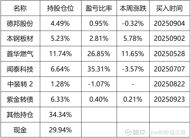 本周比较割裂,国庆节前2个交易日,节后2个交易日。我的组合由于首华燃气和首华转债的上涨小幅上涨。在三季度总结里已经写过,节前清仓了首华转债,因此仓位有所下降。目前考虑紫银转债、中装转2的持仓我的仓位在70%,如果不考虑的话仓位在63%,具体持仓情况如下: