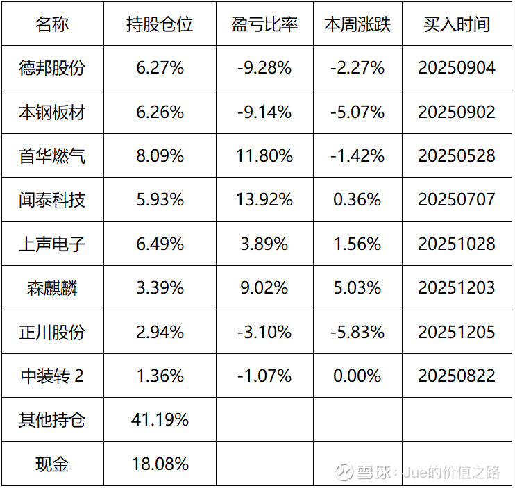 2025年周总结还剩下最后3篇,本周我的组合回撤还是比较明显的,市场整体表现并不好,基本上都是跌多涨少,本周收益回撤了1个多点,目前全年收益还能维持在28%,在还剩最后13个交易日的情况下,希望尽量少回撤,保住25%以上的收益。目前仓位82%,不考虑中装转2仓位大概80%左右,今年剩下的日子不再考虑新开仓位,本来本周蓝帆转债等几个低价转债价格出现一定下跌,不过周五蓝帆转债企稳,晚上蓝帆医疗连续发布公告,估计周一蓝帆转债会继续反弹,想要捡便宜估计要等到明年了。目前具体持仓情况如下: