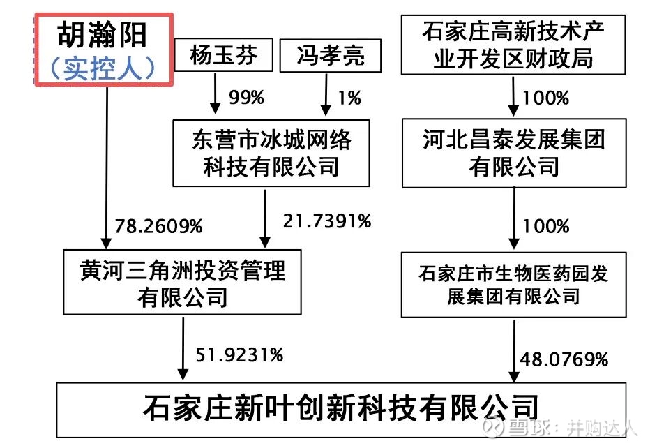 1. 收购主体: 收购方为“新叶创新”,其股东结构为胡瀚阳(40.63%)、石家庄高新区财政局(48.08%)、扬玉芬(11.17%)及冯孝亮(0.11%)。胡瀚阳为实际控制人。