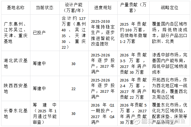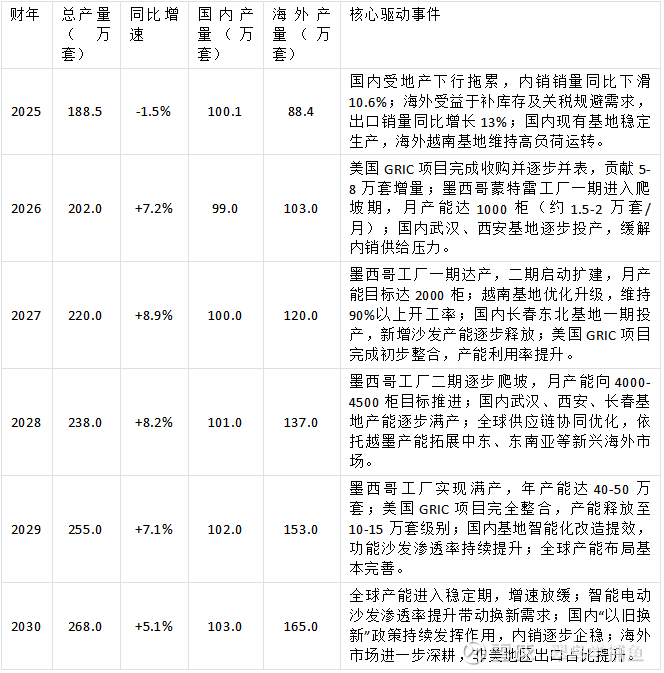 数据说明:1. 2025年数据来源于官方年报,明确披露国内沙发销量100.1万套、出口沙发88.4万套,合计188.5万套;2. 海外产量按“柜数折算+项目产能”推算(1柜≈15-20套沙发);3. 国内产量假设2027年后企稳微增,主要依托新建基地投产及渗透率提升。
