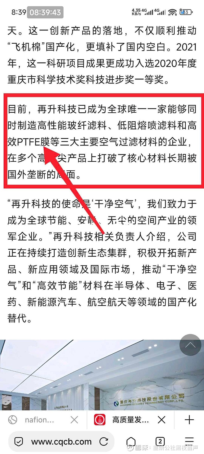 $再升科技(SH603601)$ 再升科技氢能源再度重磅挖掘!再升科技的PTFE膜也是打破国外垄断的!据新闻报道:再升科技已成为全球唯一一家能够同时制造高性能玻纤滤料、低阻熔喷滤料和高效PTFE膜等三大主要空气过滤材料的企业,在多个高精尖产品上打破了核心材料长期被国外垄断的局面。再升科技生产的聚四氟乙烯PTFE,是目前最为商业化的氢能源燃料电池质子交换膜全氟磺酸(PFSA)的唯二关键材料。新闻来源:网页链接$雪人集团(SZ002639)$ $中国西电(SH601179)$