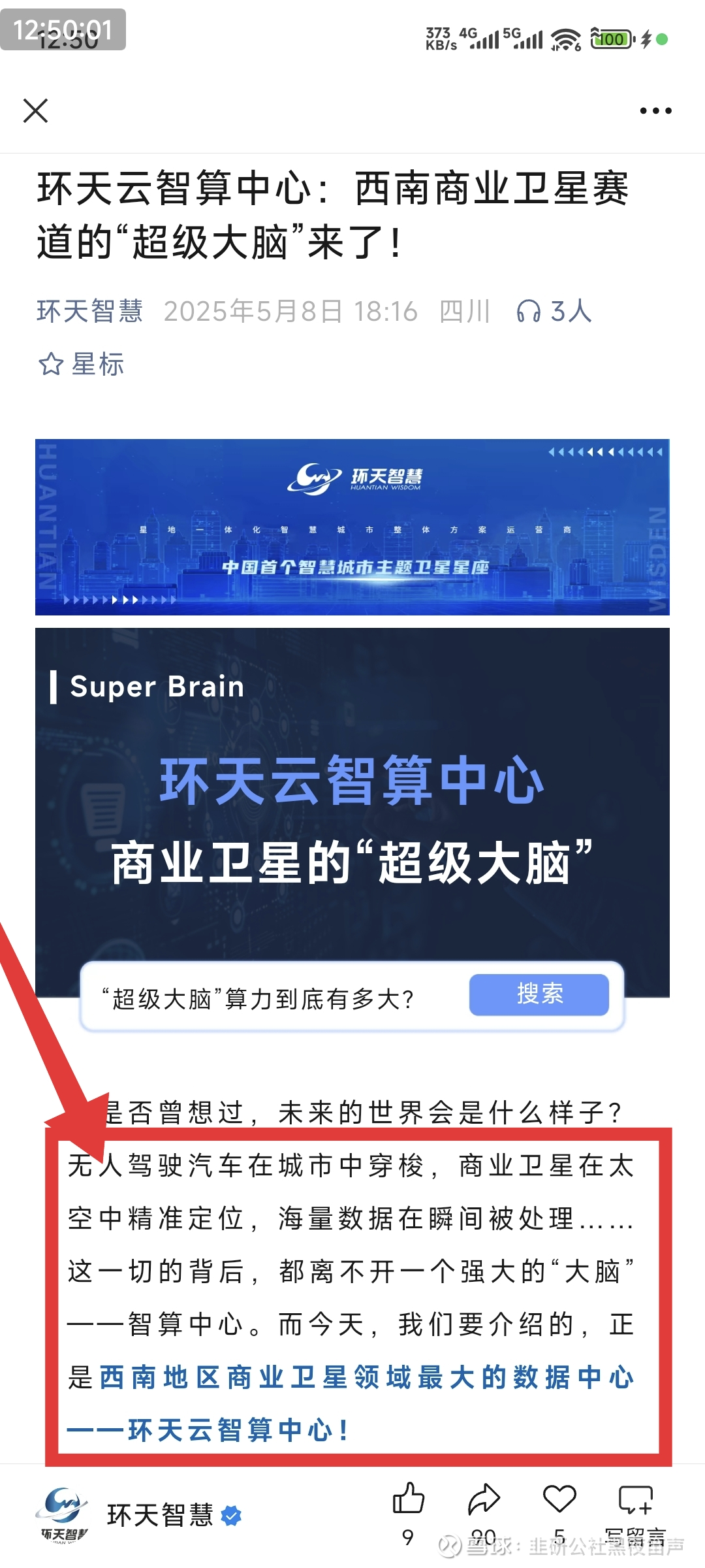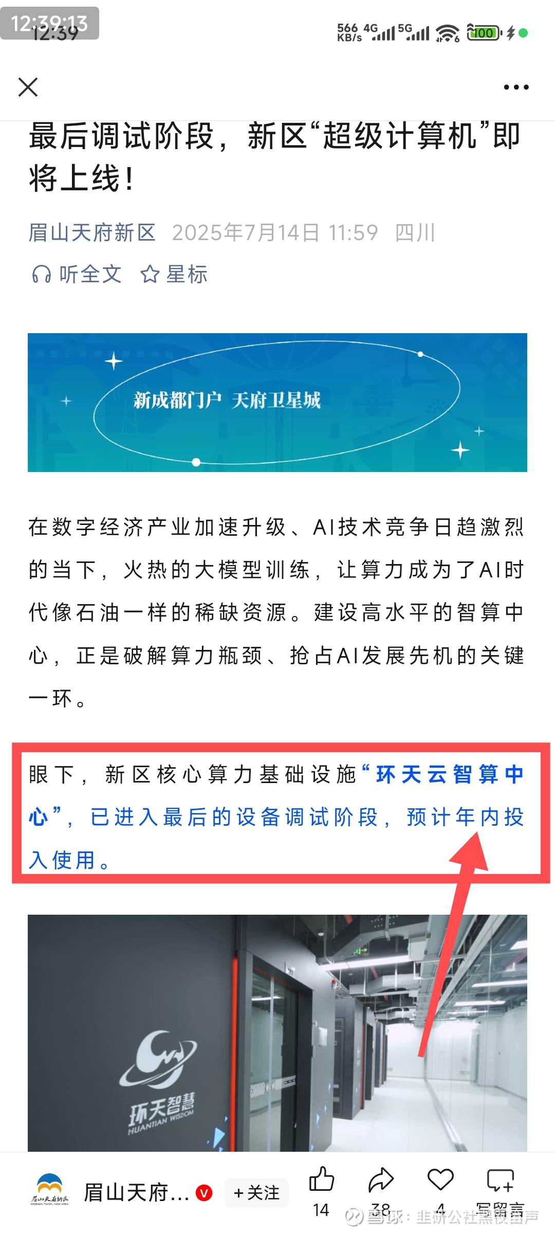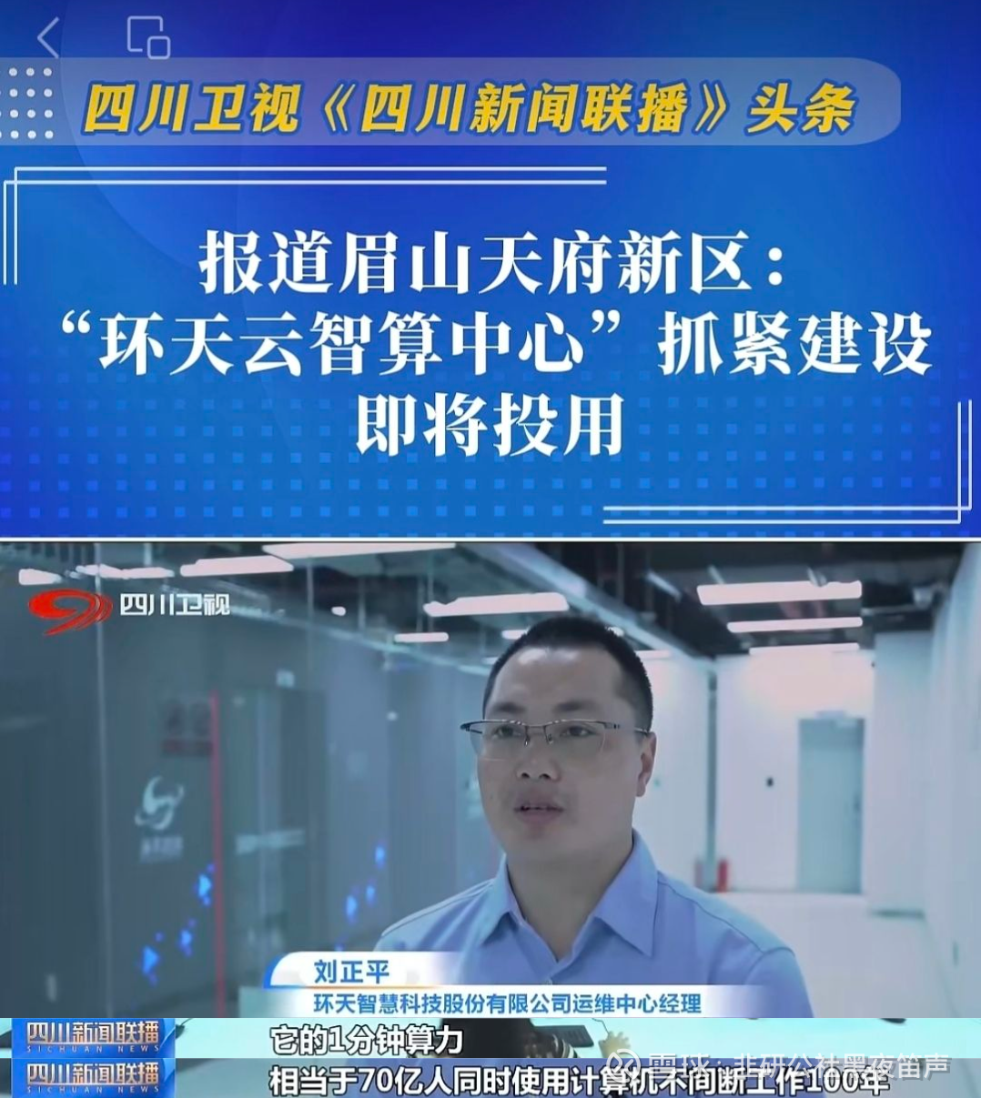 综合《四川新闻联播》头条、眉山天府新区官微、环天智慧官网,环天智慧建设的我国西南地区商业卫星领域最大数据中心环天云智算中心预计年内投用,该数据中心为企业布局在太空中的环天星座20卫星提供遥感数据处理服务,以及时空数据大模型训练。 “它的1分钟算力相当于70亿人同时使用计算机不间断工作100年。”