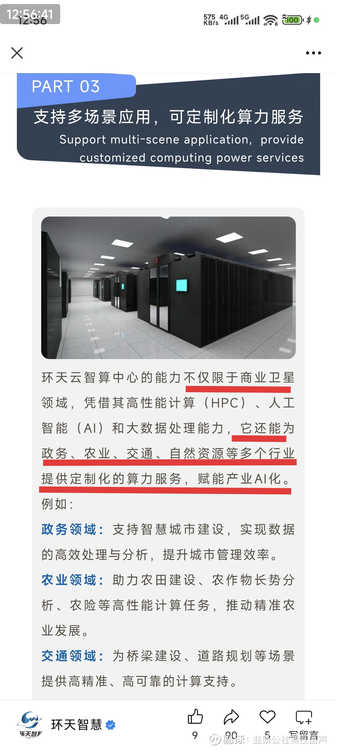 它的能力不仅限于商业卫星领域,凭借其高性能计算(HPC)、人工智能(AI)和大数据处理能力,它还能为政务、农业、交通、自然资源等多个行业提供定制化的算力服务,赋能产业AI化。