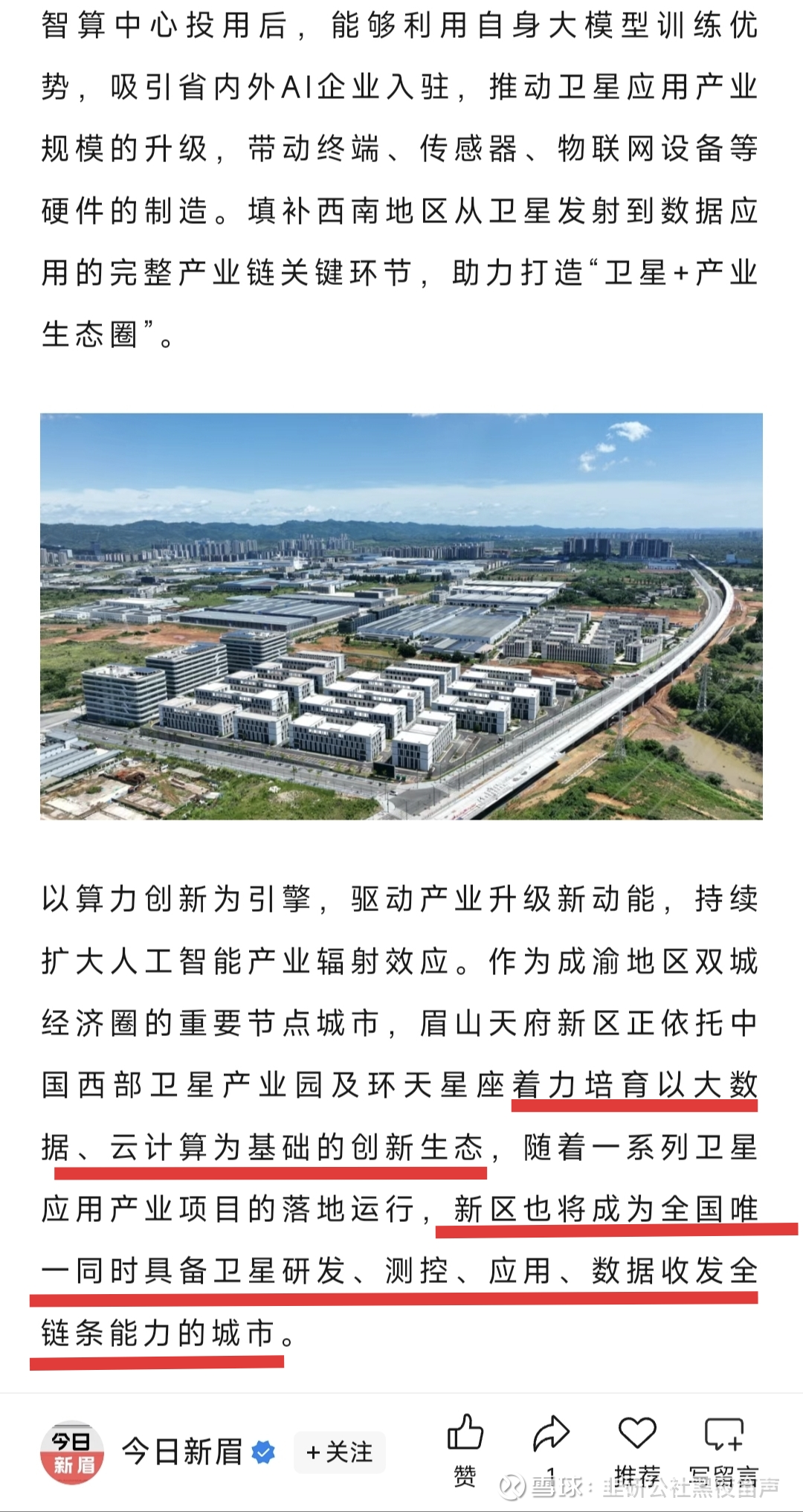 眉山天府新区正依托中国西部卫星产业园及环天星座着力培育以大数据、云计算为基础的创新生态,随着一系列卫星应用产业项目的落地运行,新区也将成为全国唯一同时具备卫星研发、测控、应用、数据收发全链条能力的城市。