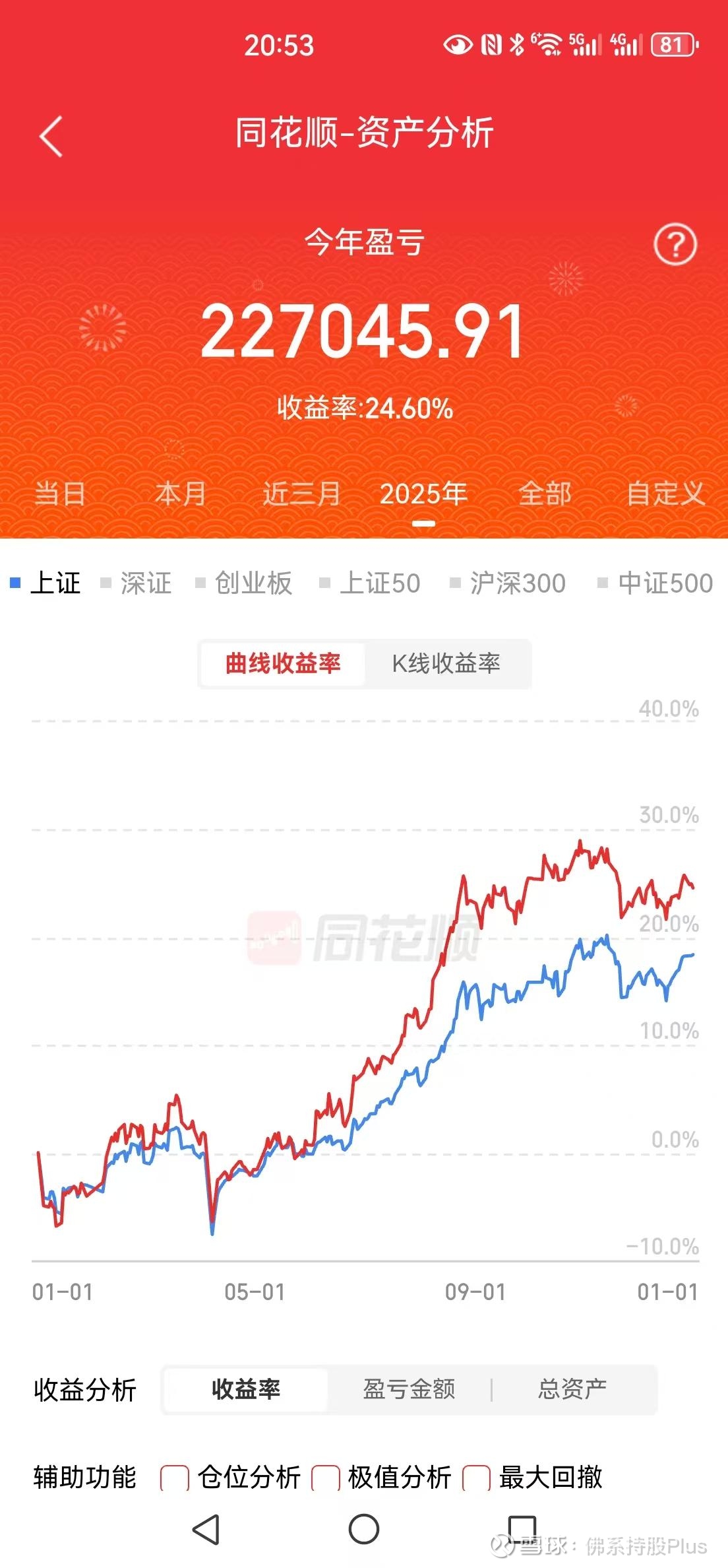 2025年1月1日账户总资产179万;2025年12月31日账户总资产222万;2025年年收益43万;2025年年收益率24%。