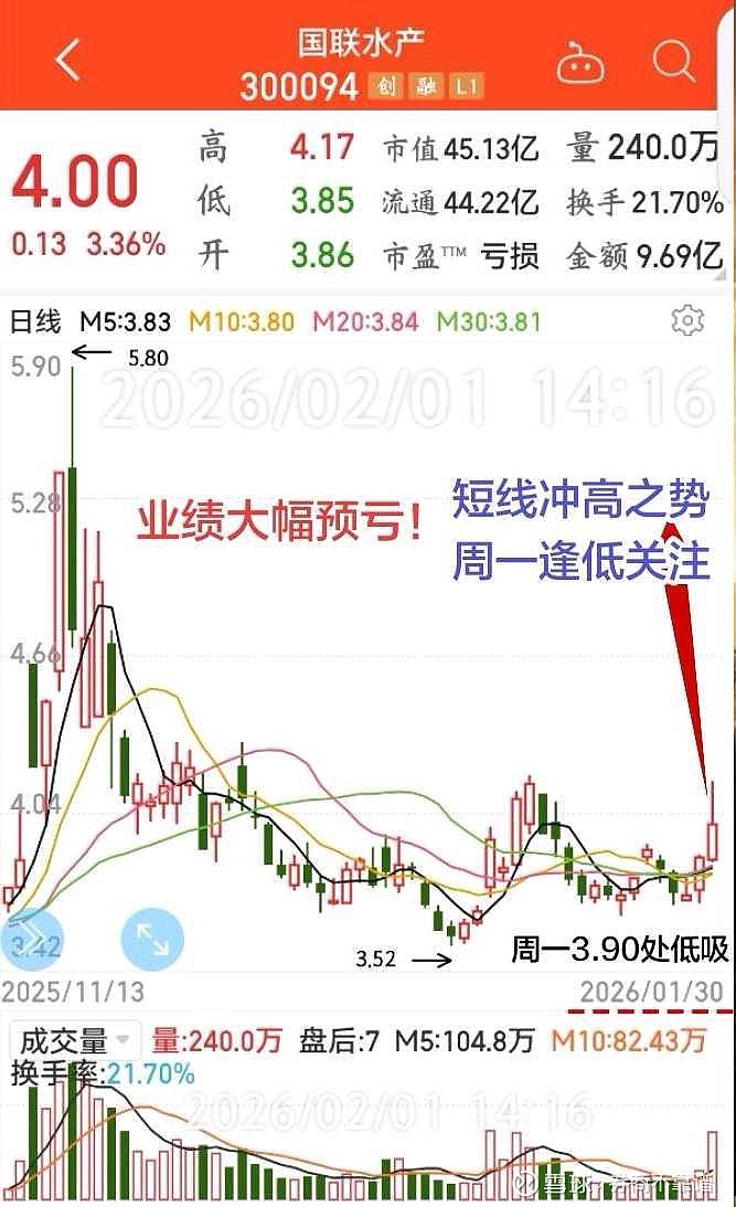 上周,农业板表现强劲,大盘暴跌之下更为抢眼。国联水产:随农业板强势也略有表现,业绩预报大幅亏损,但公司也在规划转型,将集中资源以预制菜为核心主业。盘面观测:有资金介入,短线有望继续拉升。(练盘.愚乐.非操作!)