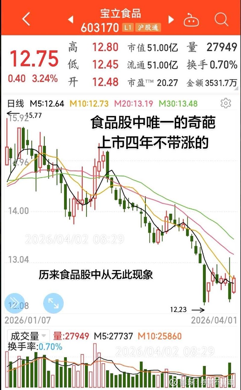 宝立食品:食品股中最奇葩的,绝无仅有的一只上市四年从没涨过的(最低点起涨至翻倍),就连一家卖包子馒头的芭比食品都能从最低11.63起→涨至最高34元。历来上市的食品股都有从最低涨至翻倍的表现,唯独宝立食品是最差的。宝立食品基本面良好,又无任何利空,现价较合适保守稳健型的,介入就当存银行了。
