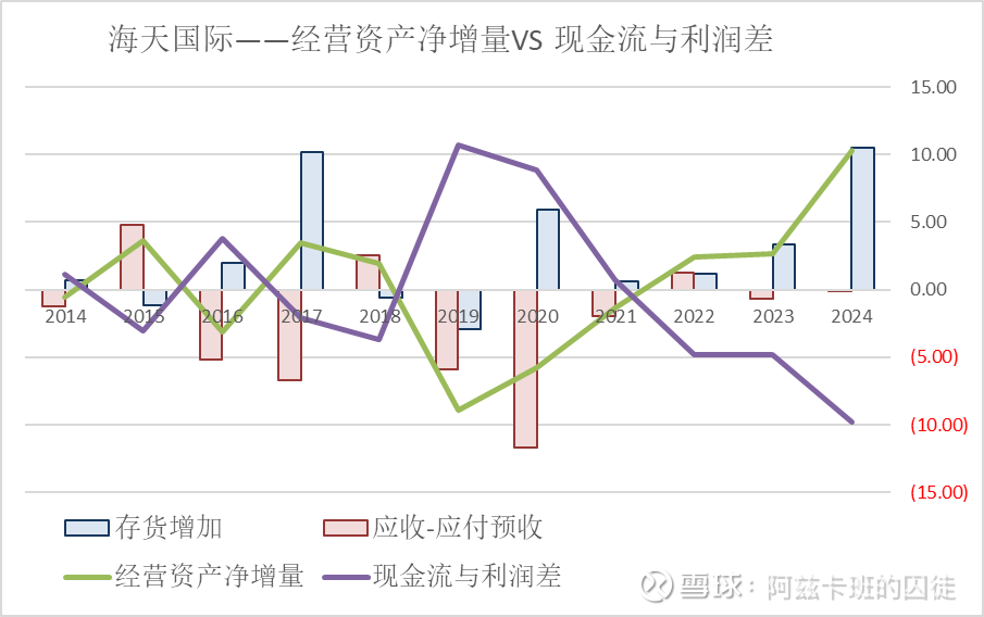 2、“存货增加”是吞噬现金流的首要影响项;而海天国际的“应收”、“应付+预收”总体上贡献了正向的经营现金流。Y轴代表吞噬了多少现金流。也就是说,海天国际最近10年总体上,上下游话语权是强势的,但是不断增加的存货吞噬了大量现金流。