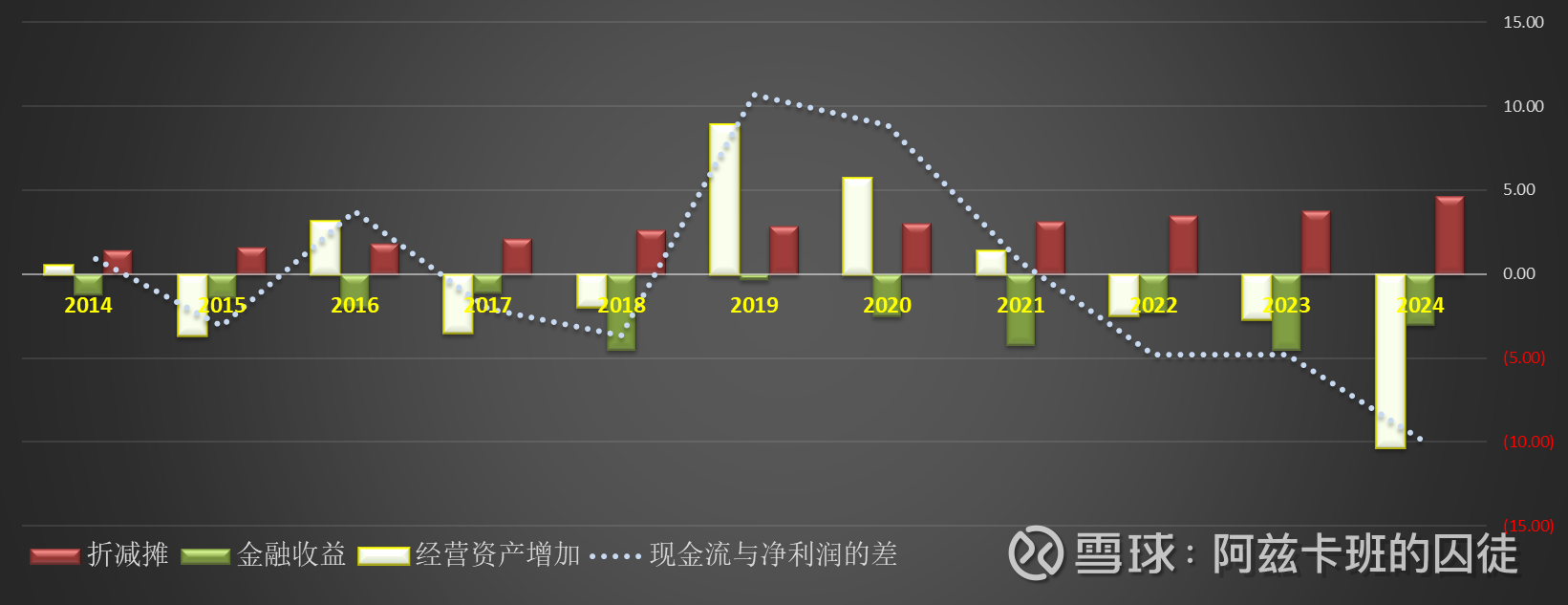 最后,再讲一条——吞噬现金流的第二大项目:金融性收益。注意第一张图里的绿色柱子,每年都在吞噬现金流——确切说是“增利不增现金流”。近10年金融性收益创造了27亿无现金流的净利润,基本上把“折减摊”贡献的31亿现金流给消耗了。