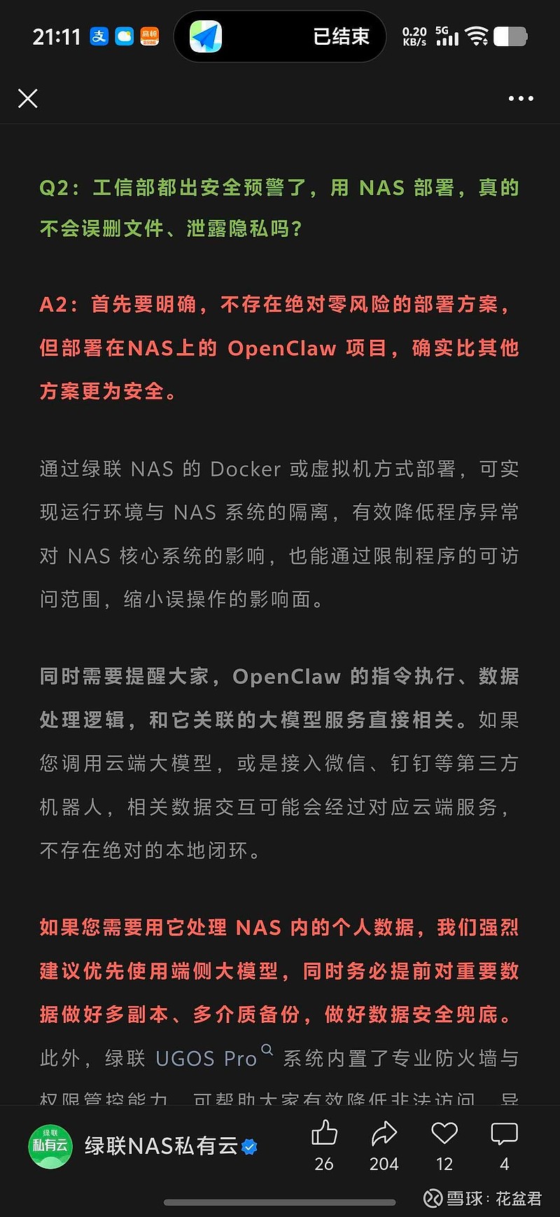 $绿联科技(SZ301606)$ 最好的虾塘Q3:用绿联NAS“养龙虾”有什么好处?这个“龙虾”到底有什么作用?A3:用绿联NAS“养龙虾”的优势,我们昨天的推文以及前文都有提到,就是可以更好规避隐私泄露、“裸奔”等安全风险。配合端侧大模型,龙虾甚至可以帮你更好地管理文件,但重要数据建议先多重备份哦。