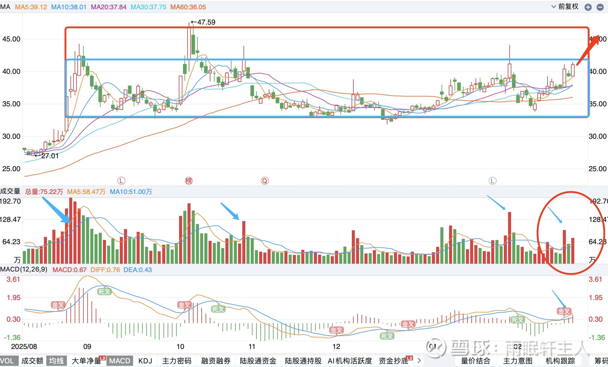 当前就是横盘蓄力、憋大招阶段,横得越久,爆发力越强。接下来重点盯放量突破42元,量能一爆,直接打开主升行情;回踩38-39元缩量企稳,就是优质低吸点。