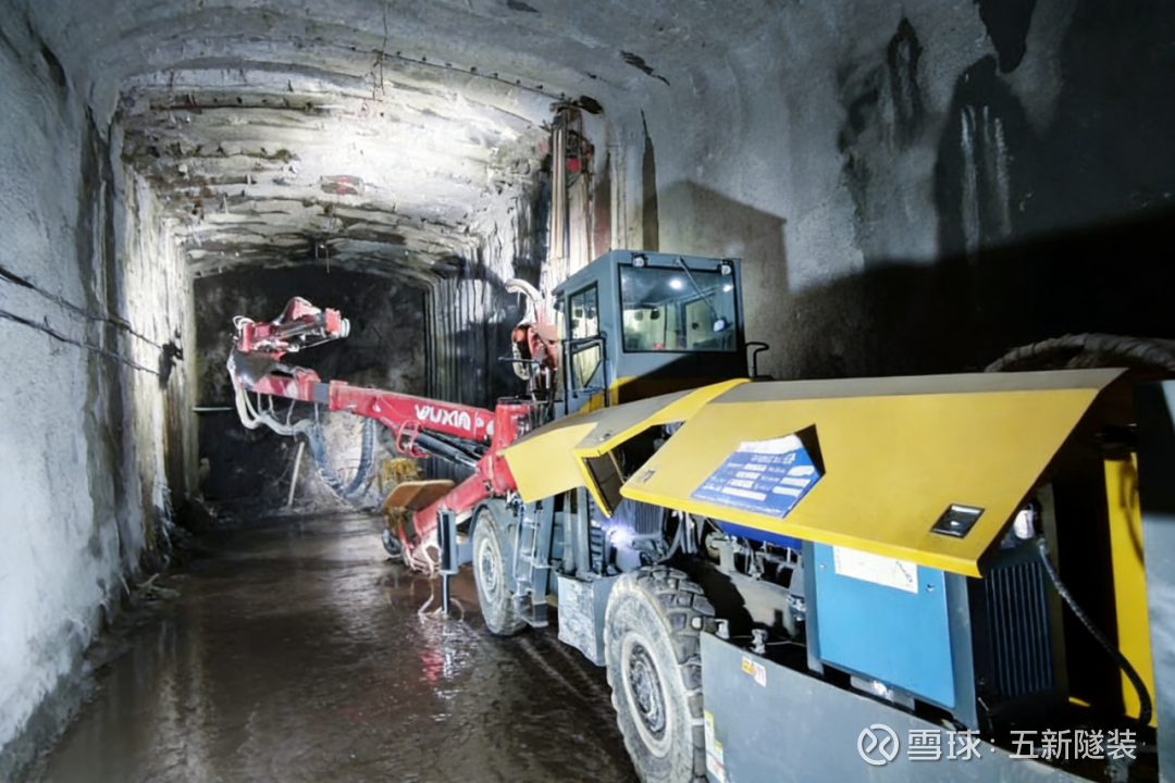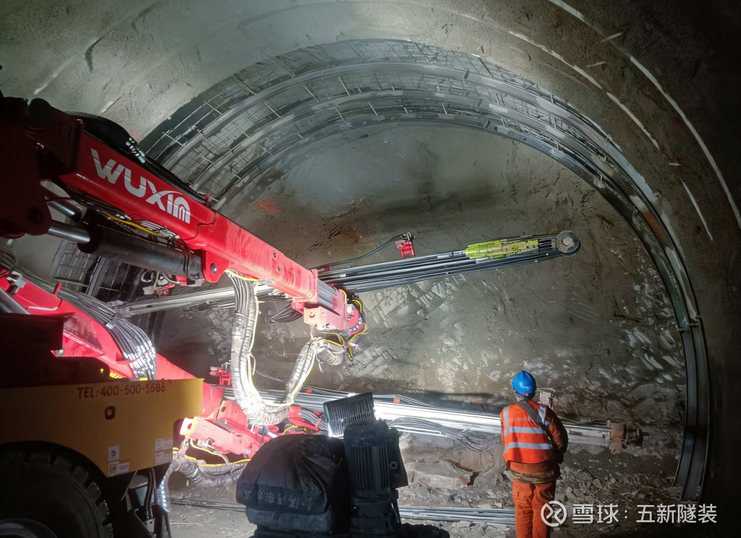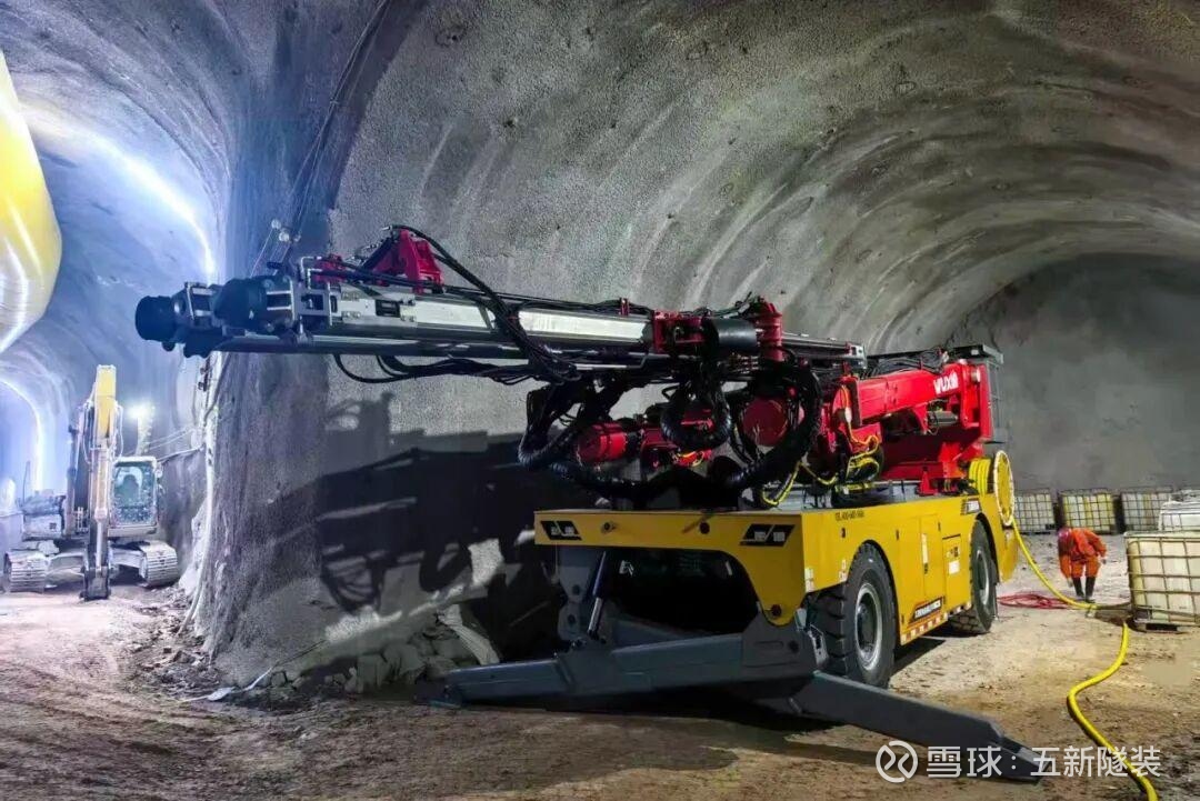 同时,项目另配备一台五新双臂电脑凿岩台车WD622,主要应用于交通洞、主厂房的6米及9米锚杆孔施工作业。该区域断面大小为10×10m,锚杆长6米,孔深6米,钻孔孔径分为64mm、76mm,单根锚杆用时3分钟,每小时可完成13-15根锚杆施工。针对项目破碎岩层易出现的卡钻难题,五新装备专项定制易返钻头,有效攻克施工技术痛点,大幅提升作业稳定性与连续性,为锚杆安装及后续注浆工序的有序推进提供了有力保障。