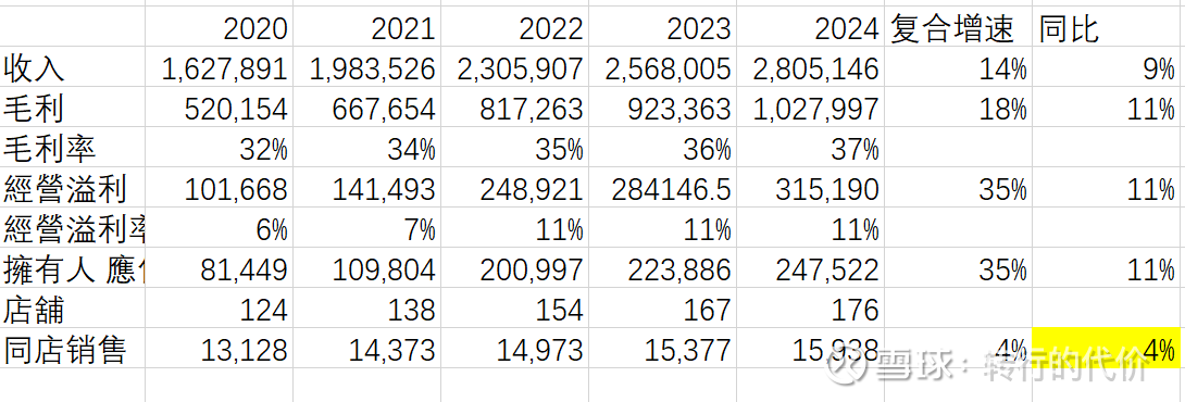 2:过去5年营收复合增速14%,归母利润率复合增速35%;24年同比增长11%,同店销售健康连续增长,24年单店达1594万港币;