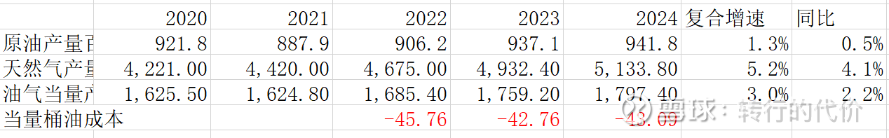 中国最大的原油,天然气开采公司;2024年原油产量9.4亿桶,5年原油产量复合增速1.3%;天然气产量5134 十亿立方英尺,5年天然气产量复合增速5.2%;合计油气当量产量18亿桶,5年产量复合增速3%,当量天然气产量目前占比48%与原油接近.