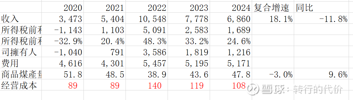 公司商品煤产量一直在4800万吨左右,权益产量3800万吨波动,近5年没有增量,估计短期未来几年也没有增量;盈利全靠价格驱动;现金成本93澳元/吨,即使考虑热值高一些,成本也高过国内主力矿神华,中煤;考虑加上其他所有运营成本,公司整体经营成本24年是108澳元/吨;当前煤炭价格下行,25年中销售均价已经跌倒149澳元/吨,因此利润微薄;