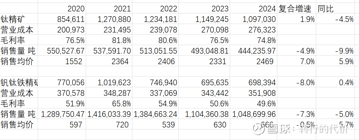 公司目前钛精矿产能55 万吨 / 年,2024 年产量45.20 万吨,产能利用率82.18%;钛精矿销量近5年复合下滑-5%证明区域受地产影响,钛白粉需求有下滑;均价维持平稳约2400元/吨,毛利率75%;