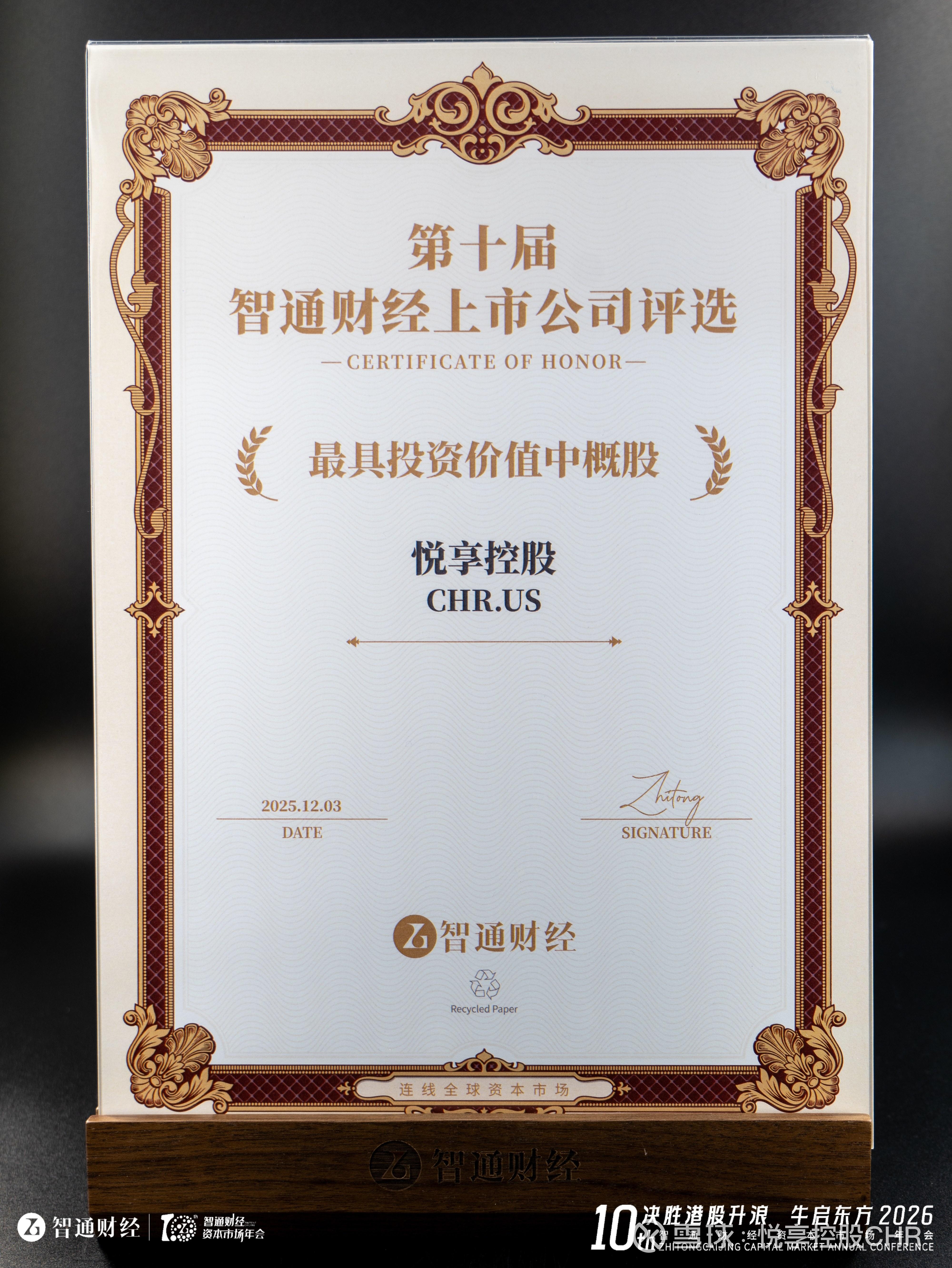 2025年12月3日,$悦享控股(CHR)$ 凭借其卓越的商业模式、优良的经营质效、持续的价值创造能力以及积极的社会责任实践,荣获 “最具投资价值中概股” 大奖。