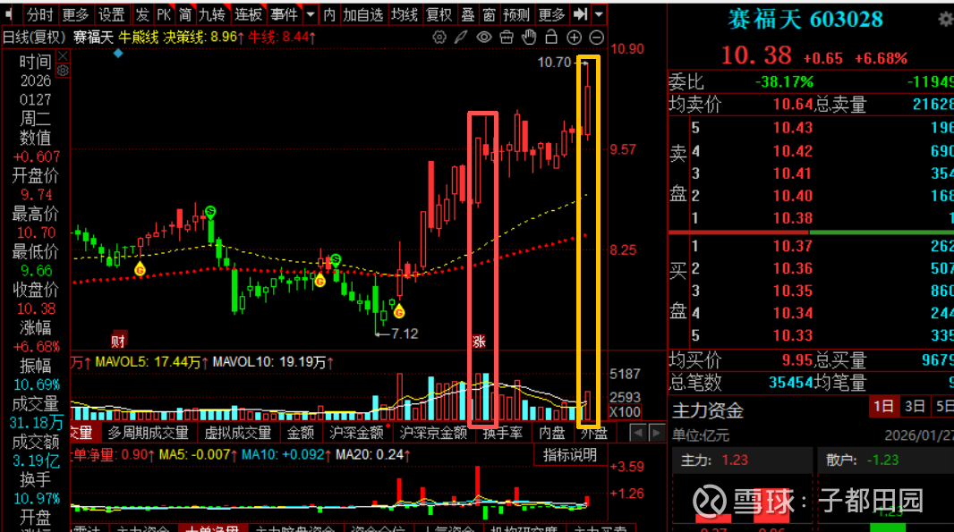 从今天的走势来看,虽然是放量上涨(下图黄色条形框,换手率10.97%)。但是,较之前的从低位上涨时(下图红色条形框,每天的换手率都超过18%)的换手率下降了很多,表明很多前面拿到筹码的人惜售自己手上的筹码,后市继续看涨的。