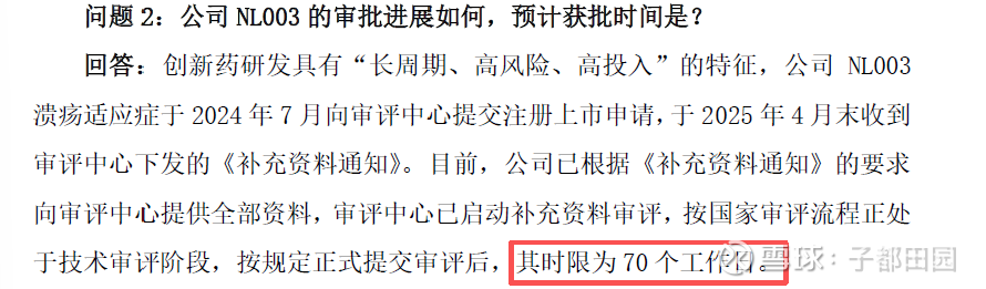 公司特意强调“已启动审评”且明确了“70个工作日”,通常意味着公司与CDE的沟通比较顺畅,认为这次补充资料是为了完善细节,而不是因为出现了致命缺陷被驳回。
