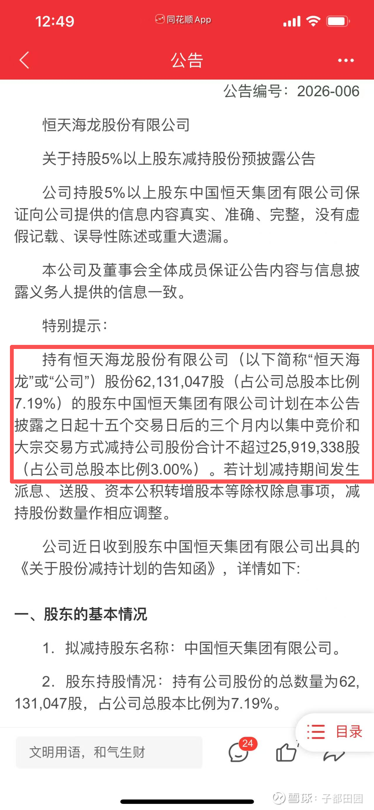 恒天海龙2026年1月28日再次发布公告,二股东继续的减持。计划减持大约其持有的3%的股份。本次减持以后,二股东恒天集团的持股将少于5%,今后减持也不用公告了。