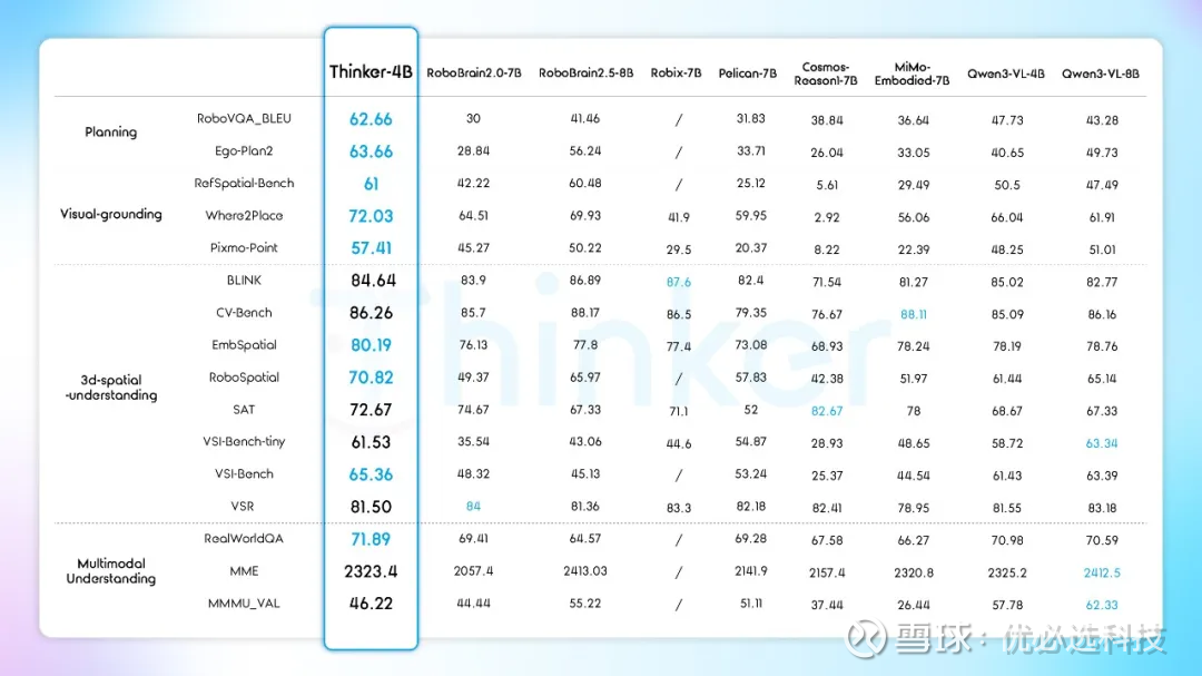 优必选具身智能大模型Thinker以“小参数、高性能、全开源”突破具身大脑领域限制。近日,在涵盖10B以下具身智能大脑模型的权威基准评测中,Thinker一举拿下9项第一,重新定义了该领域的性能标杆。这些基准全面评估了具身智能的两大核心能力:一是机器人第一视角下的场景认知与任务规划能力,二是支撑物理交互的精准感知与空间理解能力。