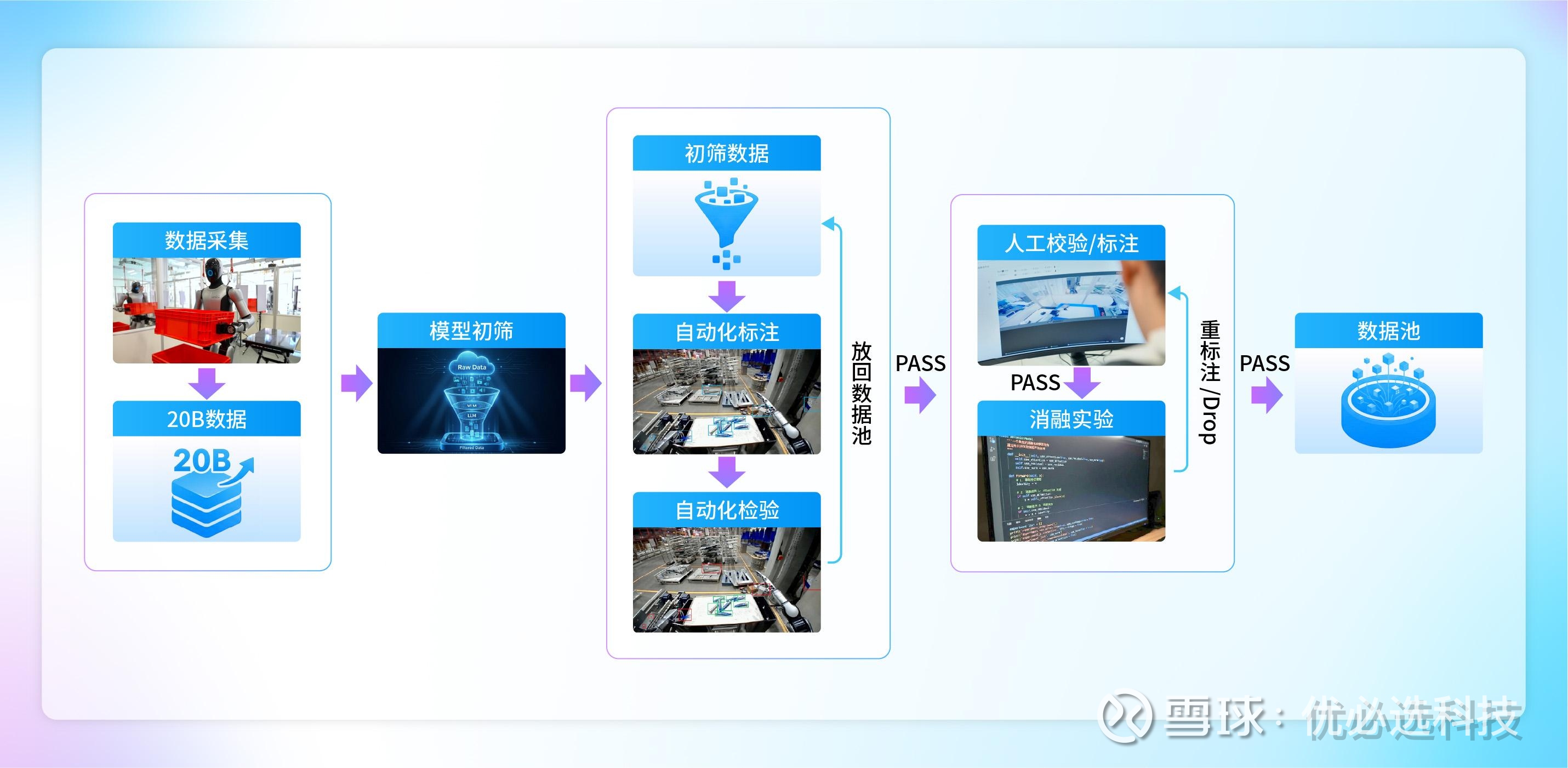 面对高达20B、含噪声、难对齐、模态缺失的原始数据,优必选构建了全流程自动化“精炼提纯”流水线。通过“数据筛选”与“质量评分”两步,实现从20B到10M级别高质量数据的极致提纯。