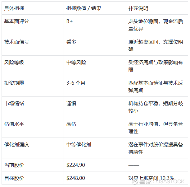 采用 “中期价值投资 + 技术面择时” 策略:以基本面(现金流、毛利率、分红)为核心锚点,依托技术面企稳信号建仓,持有周期 6-12 个月,待股价接近目标价 $248.00 或基本面出现边际恶化时逐步止盈。