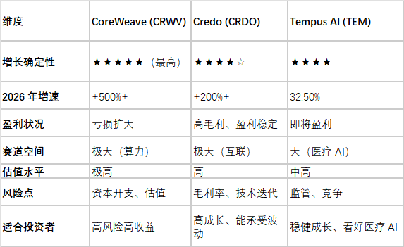 AI 全链布局:从算力(CRWV)→连接(CRDO)→应用(TEM),与英伟达、微软形成生态协同,长期逻辑极强。