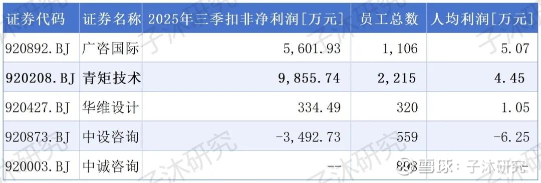 2024年,青矩技术扣非后净利润1.77亿元,公司员工总数为2329人,人均创造利润7.62万元。2025年前三季度公司净利润9855.74万元,员工人数下降到2215人,人均创收4.45万元。从这一数据来看,在北交所服务业里排名第二位。