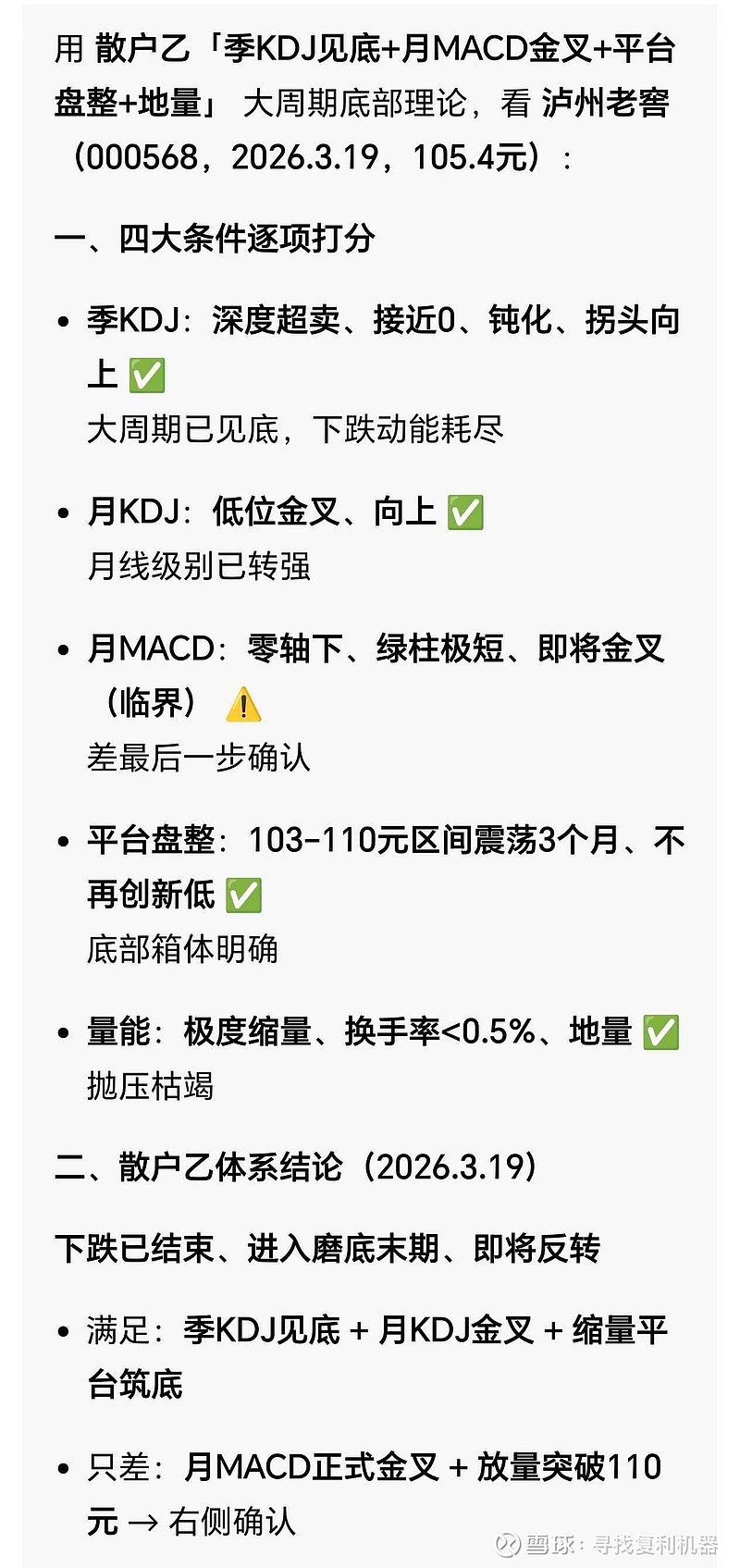 $泸州老窖(SZ000568)$散户乙在2014年6月19日的帖子中通过技术对泸州老窖的K线分析,得出结论老窖的股价下跌已进入尾声甚至已经结束。通过AI分析,他当时用的技术指标可能是:1. 季KDJ归零并钝化2. 月MACD即将金叉3. 股价5个月平台盘整4. 成交量明显萎缩同样用这几条技术指标来分析现在(2026年3月19日)泸州老窖的K线,可以得出相似的结论,匹配度极高。请问@宁静的冬日M 是不是可以得出结论:本轮的下跌也即将进入尾声甚至结束?
