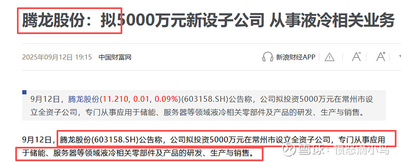 9月12日,腾龙股份公告称,公司拟投资5000万元在常州市设立全资子公司,专门从事应用于储能、服务器等领域液冷相关零部件及产品的研发、生产与销售。