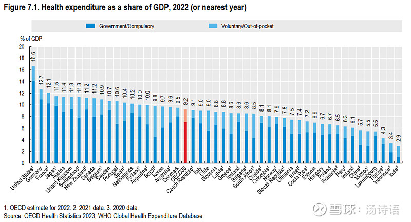 最近四年时间,代表大药企的$医疗业ETF-SPDR(XLV)$ 的涨幅不到10%,如果考虑到这几年里美国的高通胀,实际上还亏了不少;而代表生科企业的$美国生科ETF-SPDR(XBI)$ 跌了约30%,损失惨重;作为对比,美股的基准$标普500ETF-Vanguard(VOO)$ 同期涨了50%多(图1,来源:万得)。为什么会这样?因为医疗这个行业,对于国家来说,无论如何都是个成本项;就跟企业一样,成本项的部门跟收入项的部门,得到的待遇当然会不一样!尤其是,美国的医疗开支占GDP的比例逆天地高,远远高于其他主要国家的平均值(图2,来源:OECD),美国的医疗开支增速不能比GDP增速再高许多了,否则占比会越来越高的!而由于美国的GDP增速快不到哪去,所以医疗开支增速的上限也被卡死了,这跟其他科技行业(如互联网、AI等)的增速可能无上限是不同的。对于美国政府来说,医疗开支也实在太大了,2025财年的前9个月(2024.10~2025.06),Medicare花了7230亿美元(排开支项的第3),Health花了7150亿美元(排开支项的第4),如果把两者加一块则高达14380亿美元,就成了所有开支里的最大项(图3,来源:美国财政部),无怪乎特朗普搞“大美丽法案”,其中砍最多的就是医疗开支,地主家也没余粮了!(图4,来源:华创证券根据美国国会预算办公室的数据制图)拜登时期花钱如流水,美国的财政赤字率超过6%,远远高于国际公认的3%的安全线,相当危险,开支是必须要压缩的。另外,从图3里,大家应该也可以理解为什么特朗普成天催鲍威尔降息了,因为利息开支是第2大开支项。