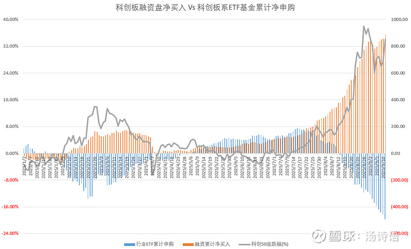 刚才发了今年以来科创板的97个ETF的申赎统计数据,我又统计了一下科创板融资盘的买卖情况,可以发现,在不少时段,它们是镜像的。科创板ETF的大神们纪律严明,掌控着千亿级别的资金,还严格坚持“网格交易”,跌的时候、低位的时候持续申购(2月18日至7月16日,期间累计净申购约526亿元),然后边涨边赎(7月16日至昨天9月11日,期间累计净赎回约681亿元),涨得越快、赎得越快,到现在可能已经实现了百亿级别的利润,注意:是已实现利润,不是浮盈!那么,这些利润来自哪里呢?很可能来自融资客,尤其是7月16日至昨天,融资客累计净买入约760亿元,几乎完美对应ETF大神们的净赎回金额。看起来,这一轮百亿级的财富转移过程已经圆满完成了。不过,资金的供应方短期内可能还不会感受到,因为市场情绪很高、成交量很大,价格能维持一段时间的,甚至不排除继续涨的可能性。$科创50(SH000688)$